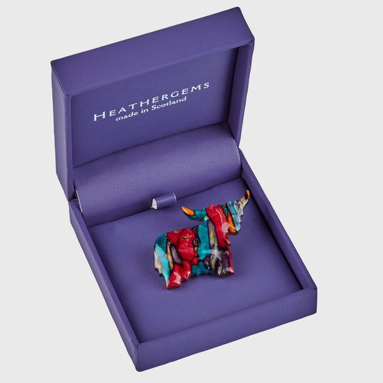 Handcrafted in Scotland, the Highland Coo Brooch is a colourful and distinctive piece of Scottish Heathergem jewellery inspired by one of Scotland’s most iconic animals. Made using handpicked Scottish heather, each brooch is shaped into a charming Highland cow design, creating a unique accessory with real Scottish character.