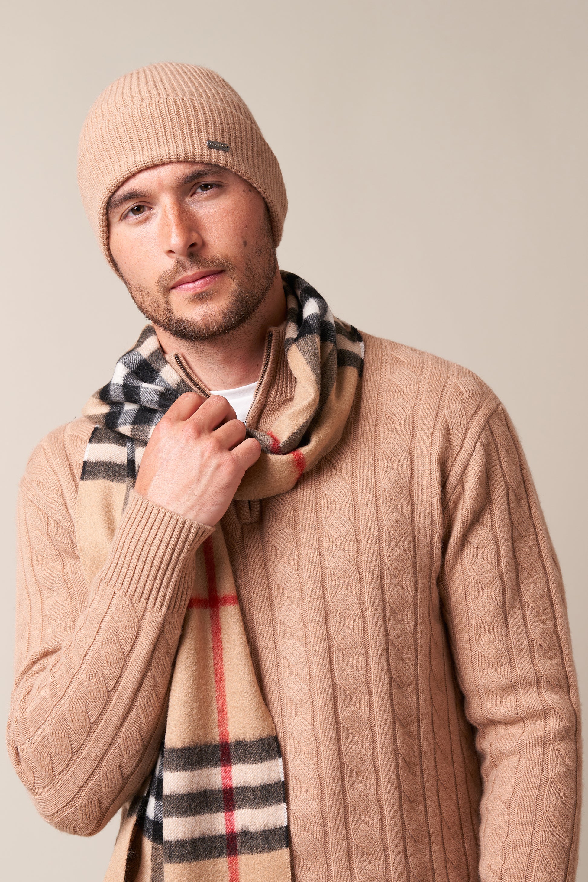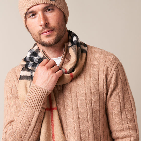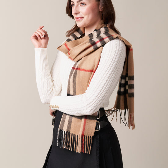 The Camel Thomson Scarf is woven in a classic tartan of warm camel tones with subtle check detailing, making it a timeless and versatile accessory. Crafted from 90% wool and 10% cashmere for a soft, warm, and lightweight feel, ideal for everyday wear throughout the cooler months.