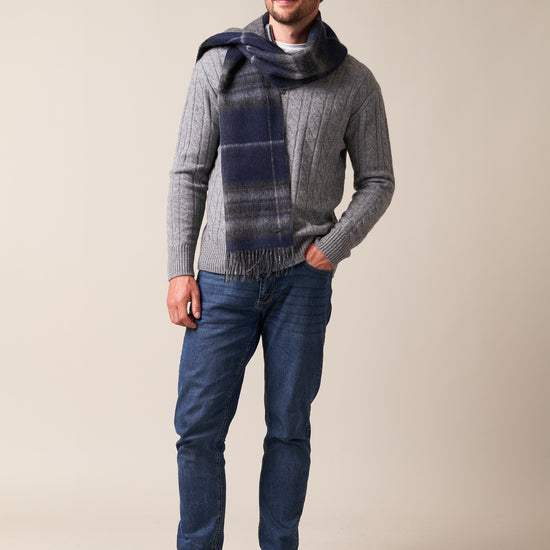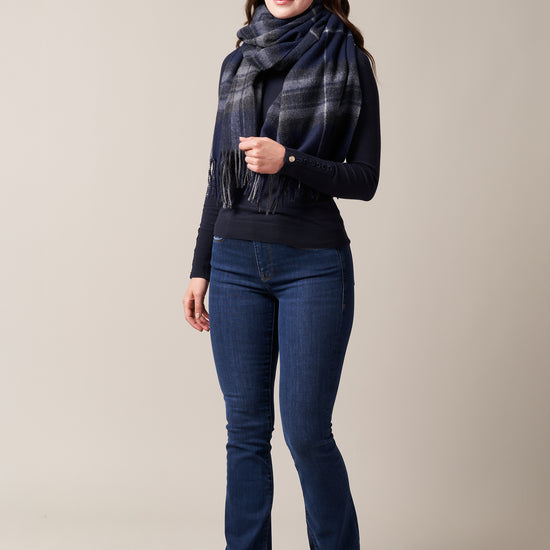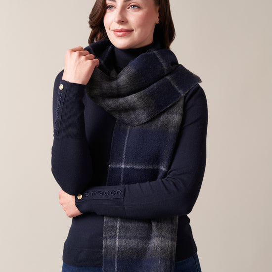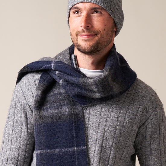 The Double Faced Midnight Pride & Grey Scarf brings together two versatile looks in one, woven from a luxurious blend of 90% wool and 10% cashmere for a soft, warm, and lightweight feel. One side features the rich tones of the Midnight Pride tartan, while the reverse shows a sleek plain grey finish, giving you the freedom to switch between patterned and understated styling.