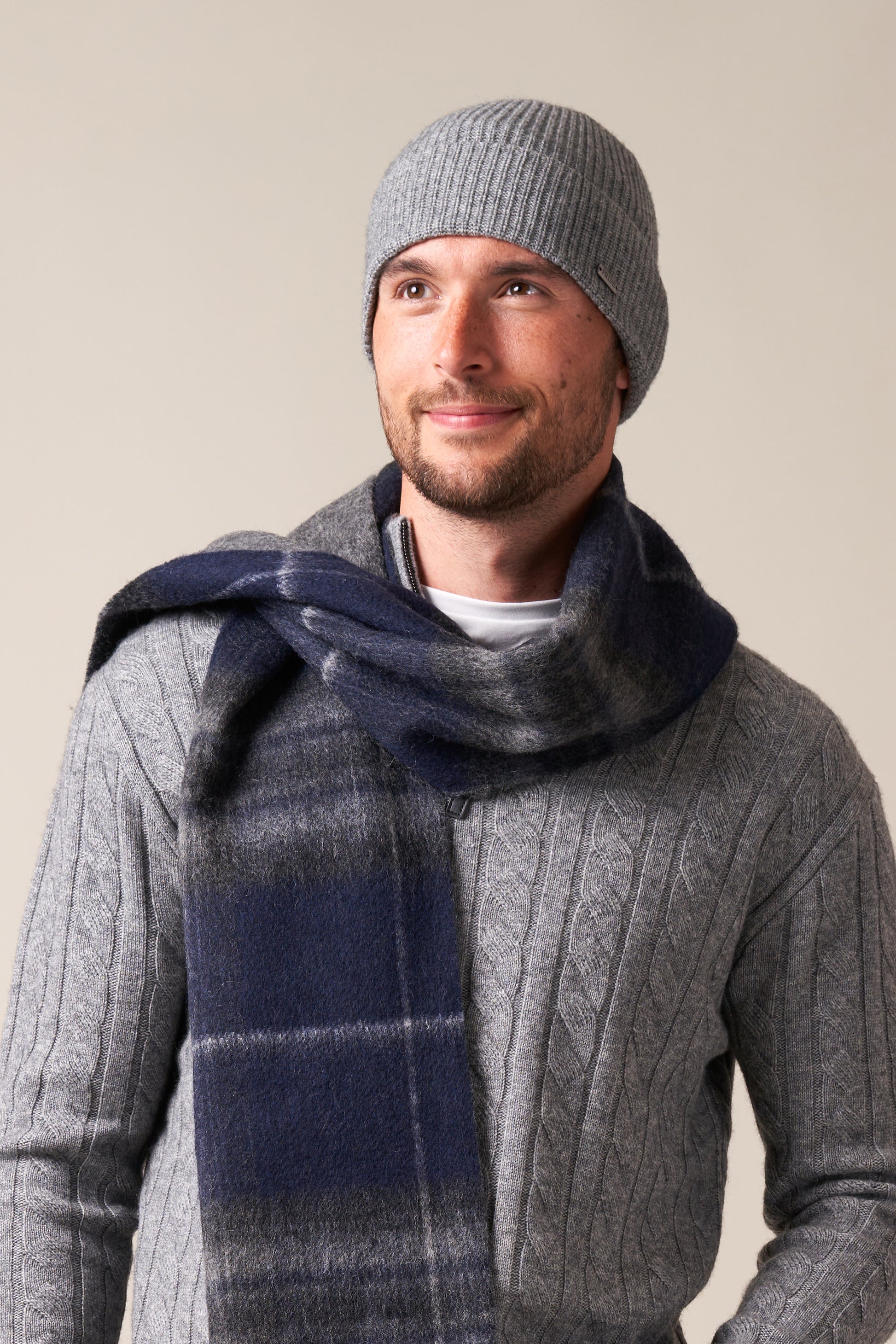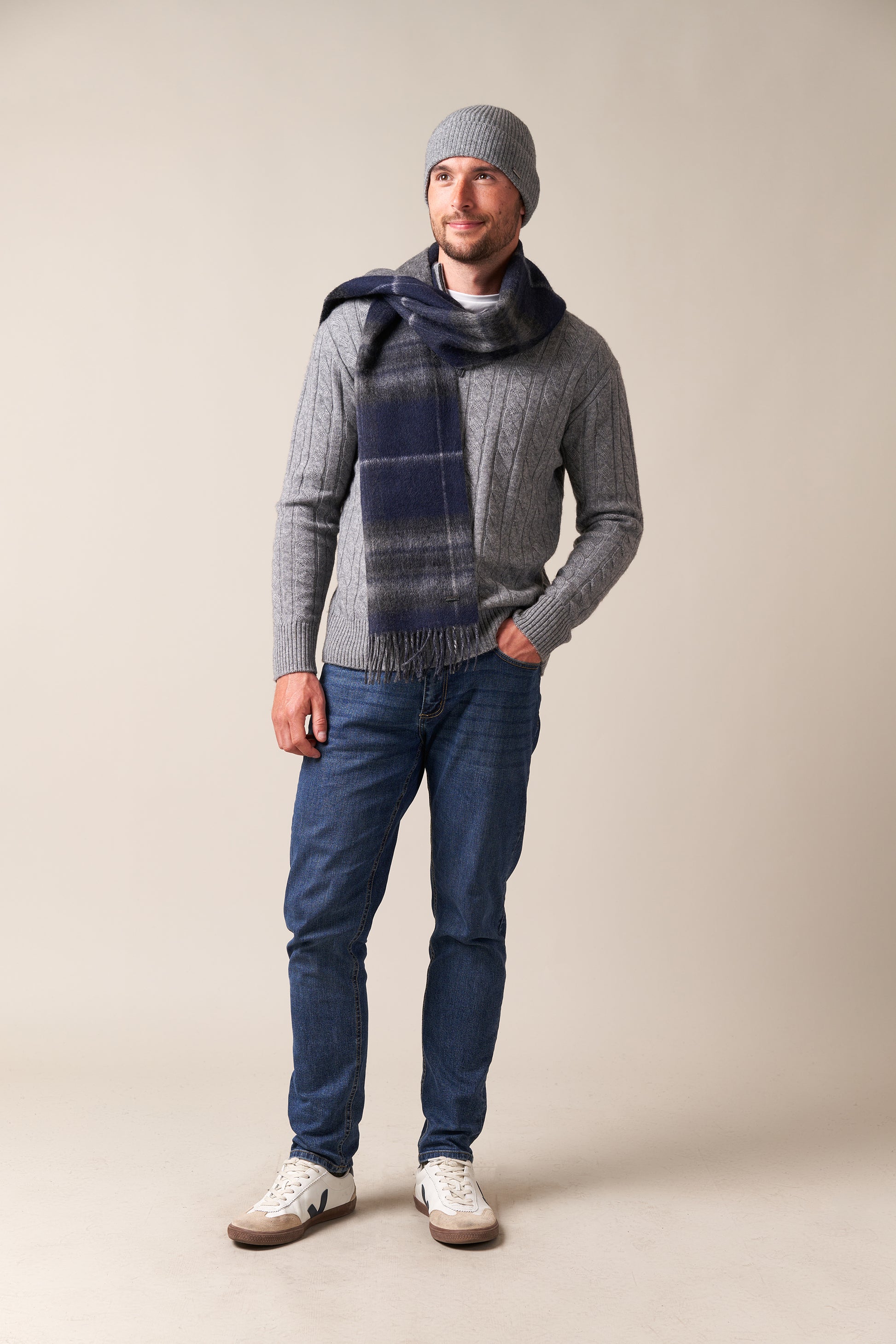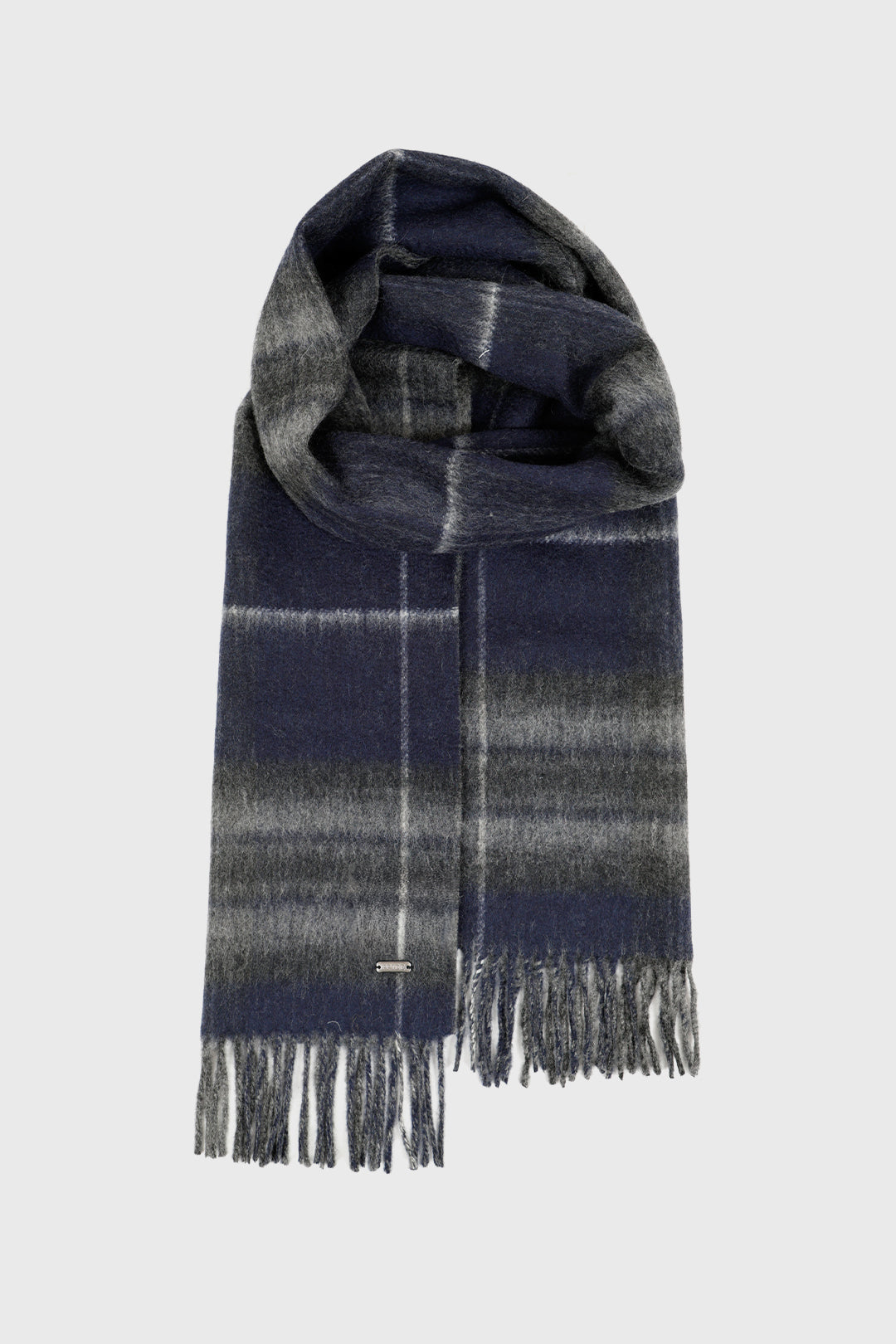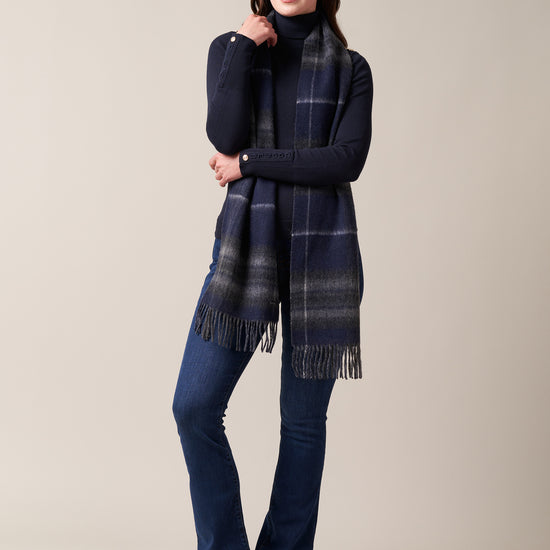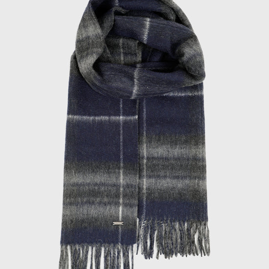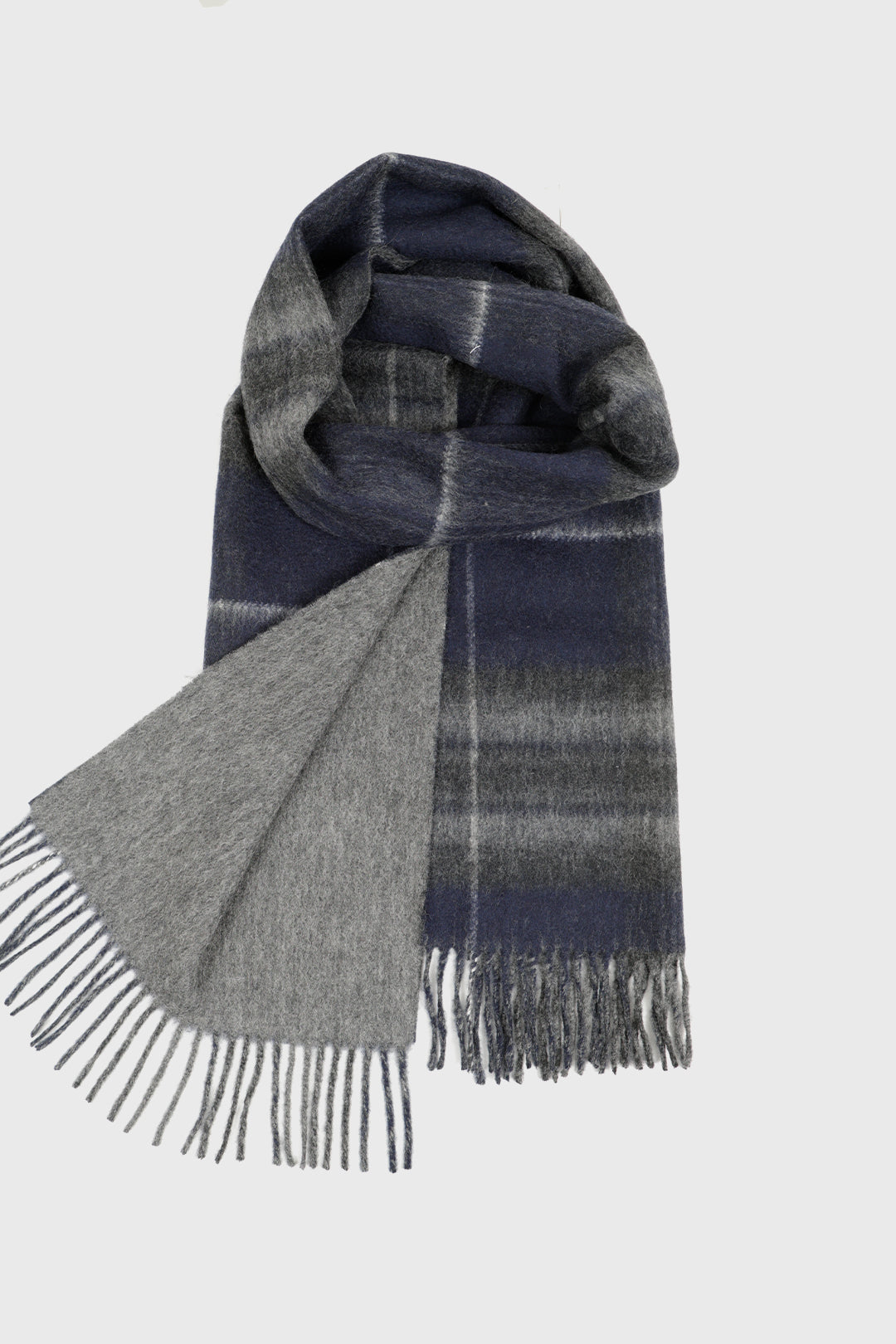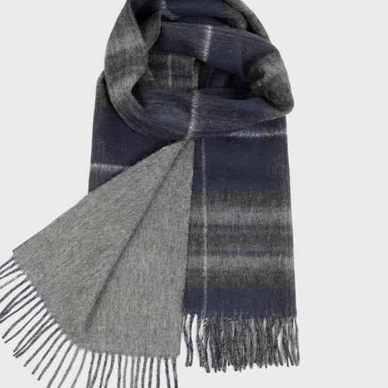 Finished with a classic fringe edge, this scarf offers modern versatility with timeless appeal. Whether worn tartan side out for a statement look or reversed to highlight the clean grey, it’s a refined accessory designed to suit every occasion.