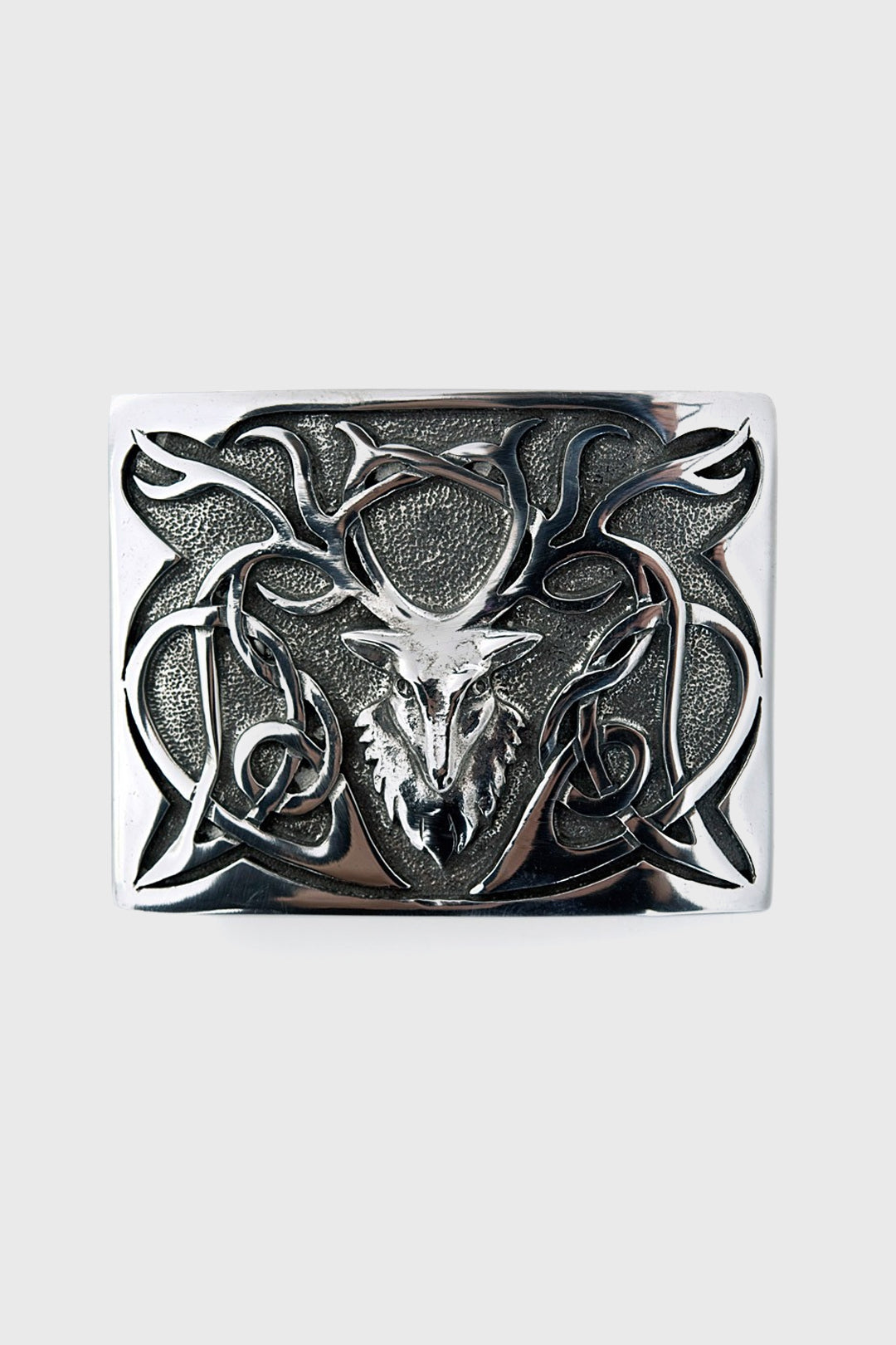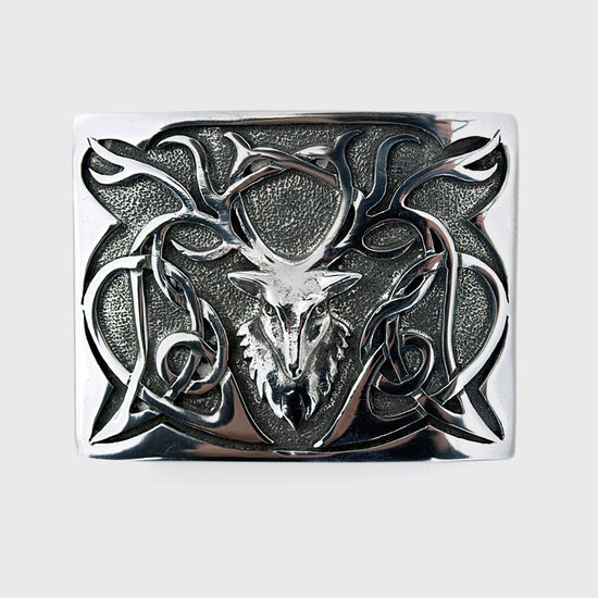 Polished pewter buckle with prominent stag head and art nouveau/celtic swirls from the antlers.