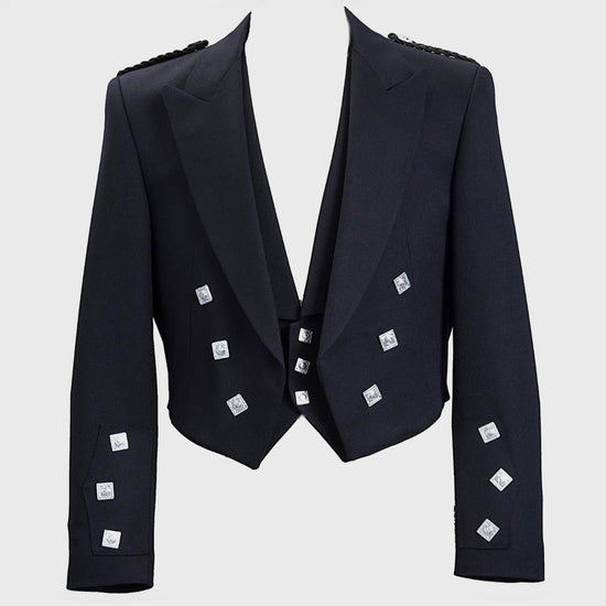 Polyester/wool mix formal Prince Charlie jacket and waistcoat set. Silver metal polished chrome buttons, braided epaulettes and satin lapels. This is the traditional formal kilt jacket, with tails (as seen in picture); to be worn with bow tie. Waistcoat has matching lapels, and two jetted pockets. Fully lined.