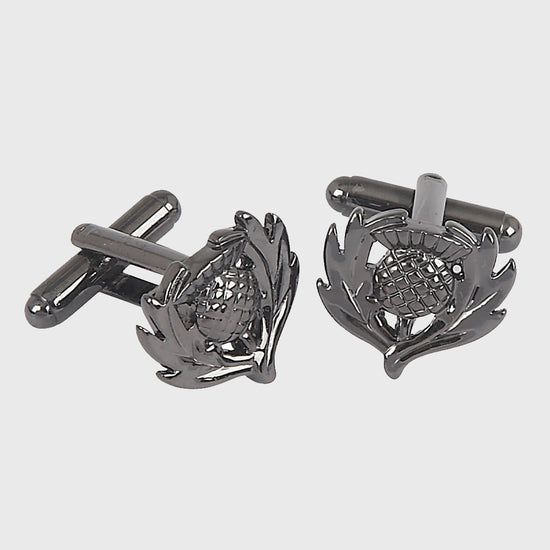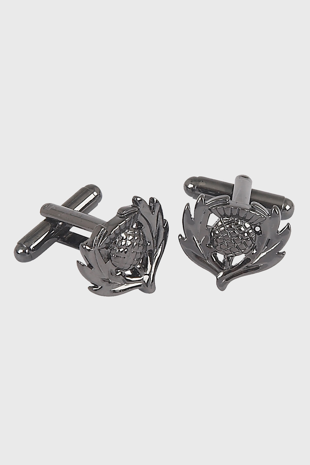 Cufflinks in the shape of a Scottish thistle. A pewter silver intricate design with black chrome finish.