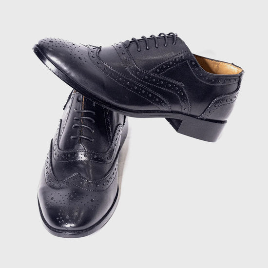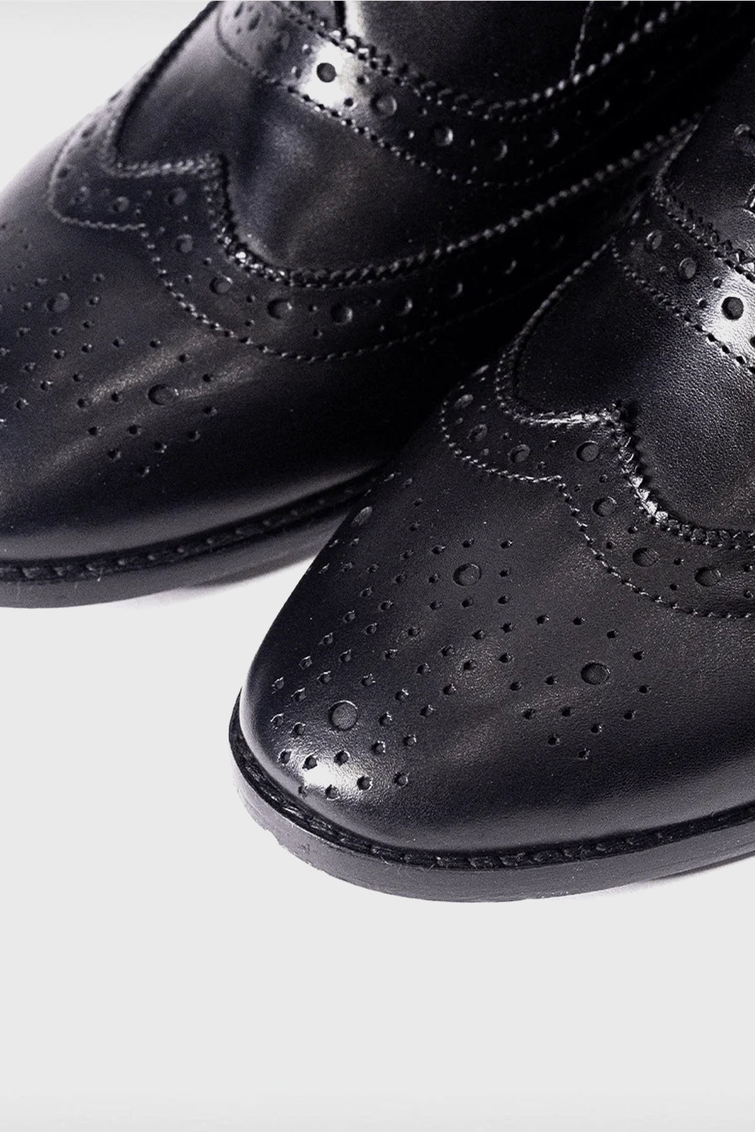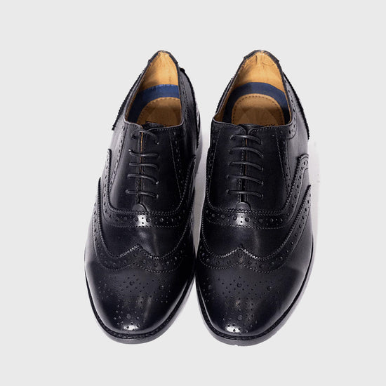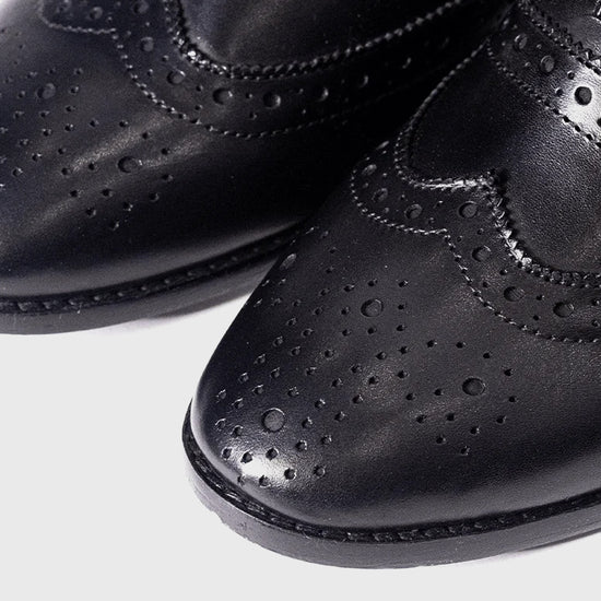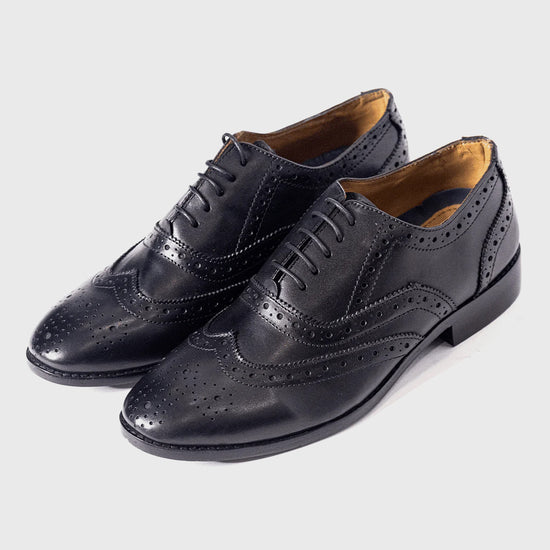 A black day brogue featuring a leather upper and Blake stitched leather man made sole.
