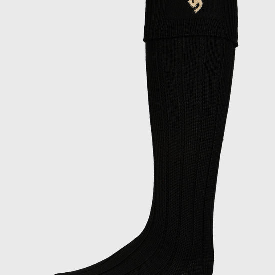 Black Merino wool blend kilt socks (hose) with a classic rib design and gold Pride rampant lion motif.