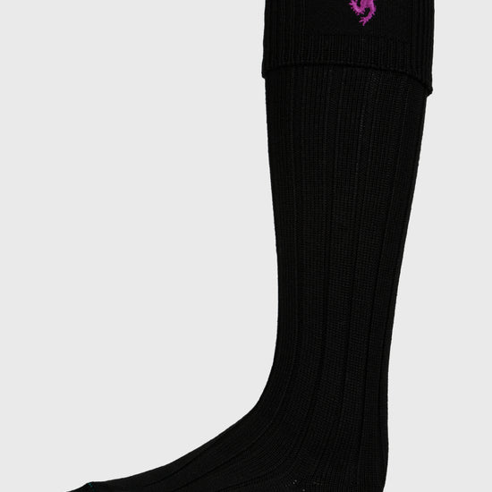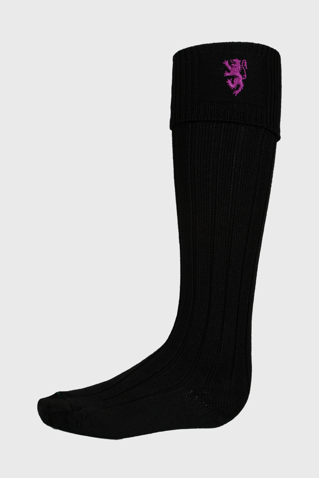 Black Merino wool blend kilt socks (hose) with a classic rib design and purple rampant lion motif.