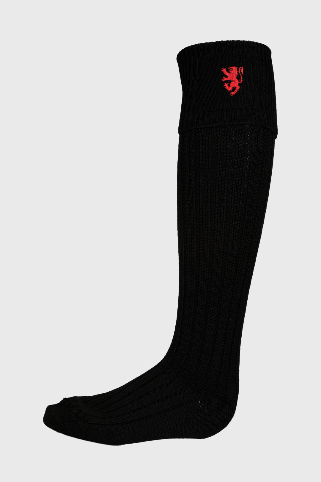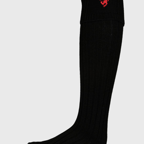 Black Merino wool blend kilt socks (hose) with a classic rib design and red rampant lion motif.