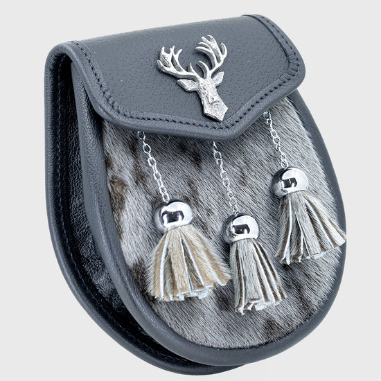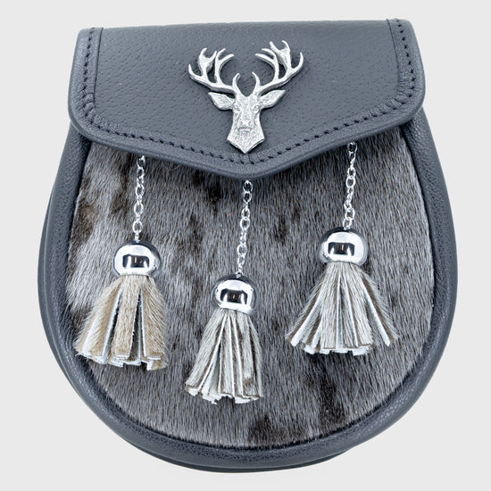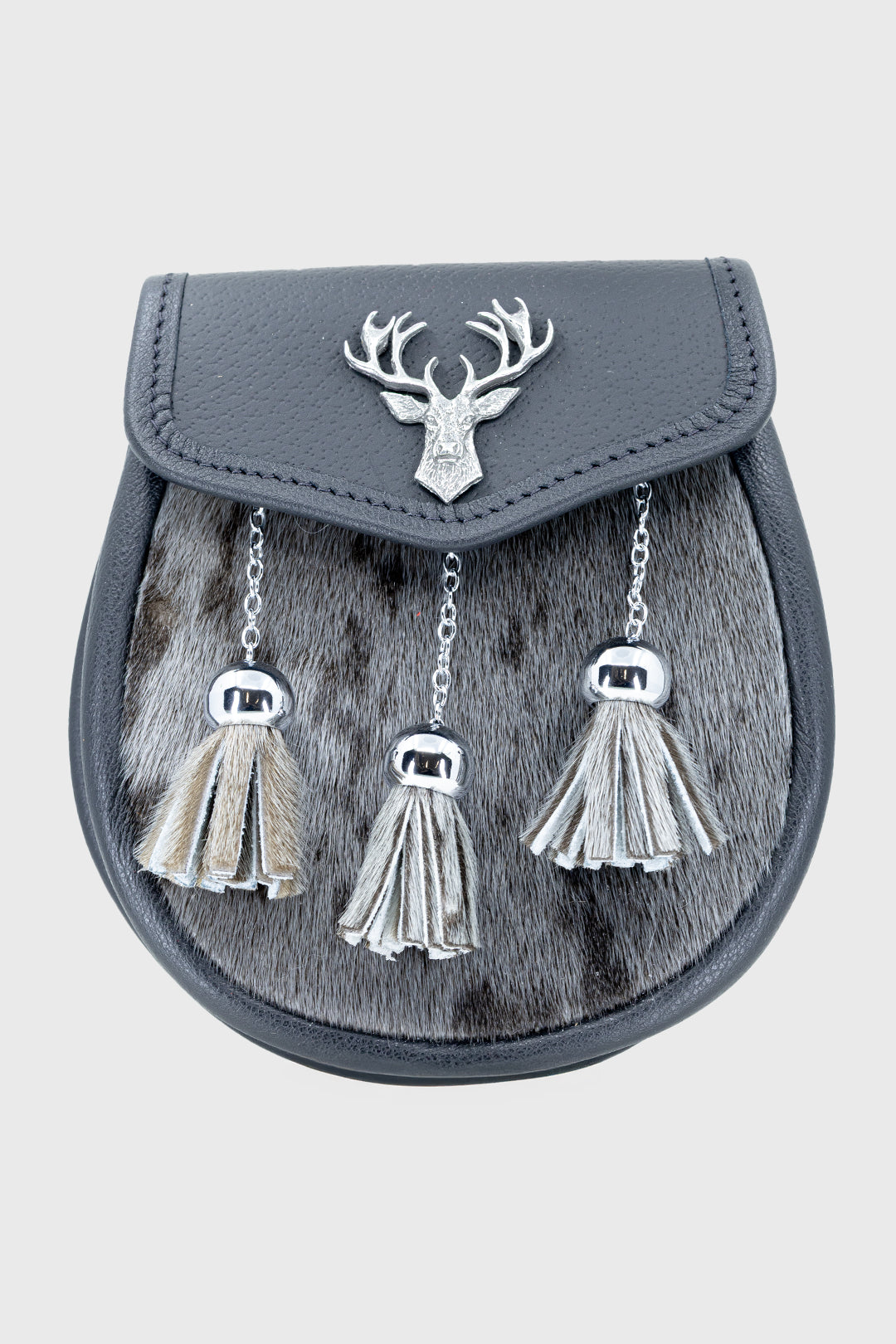 Complete your Highlandwear with this brown leather and grey skin semi-dress sporran, featuring a stag decal, intricate laser-etched detailing, and straight tassels. Combining traditional Scottish craftsmanship with modern design touches, this sporran is both practical and stylish.