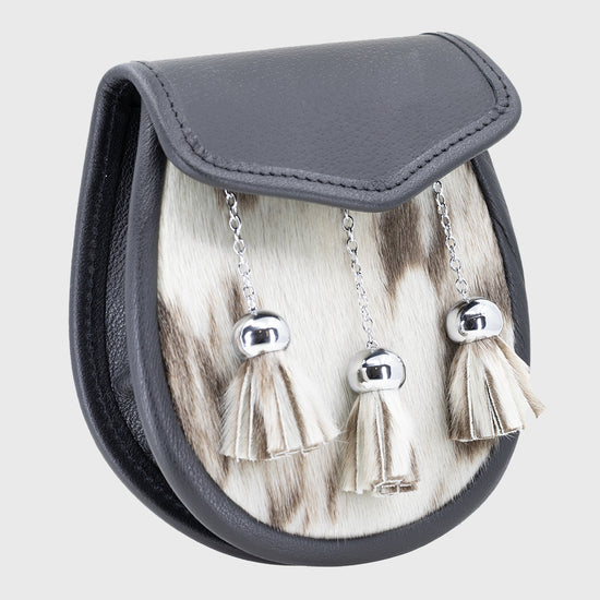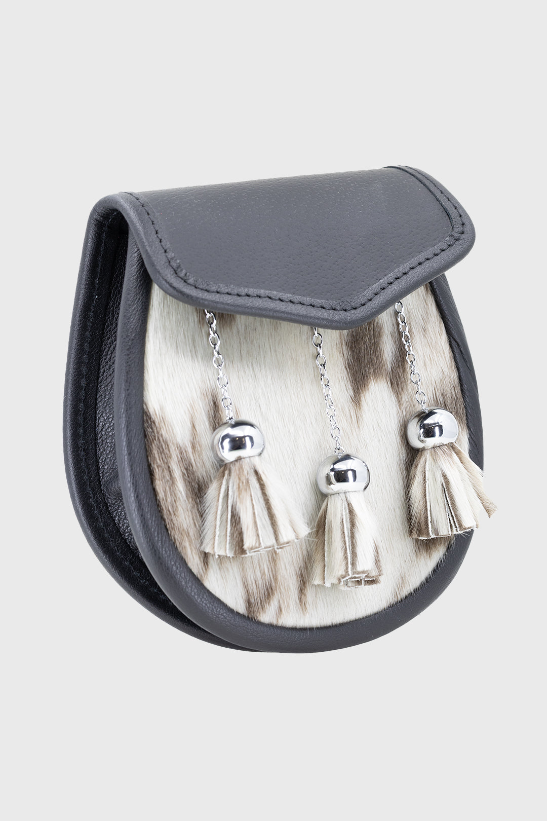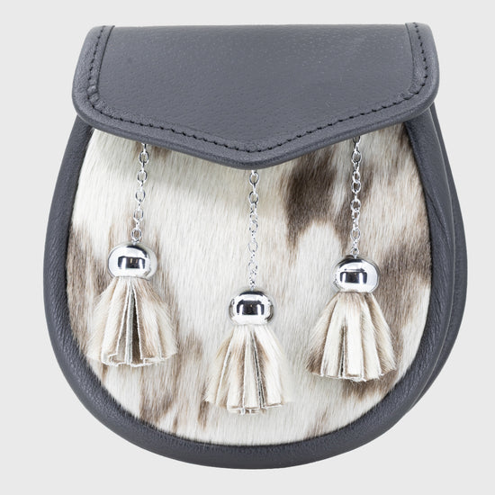 Complete your Highlandwear with this black leather and mid-grey skin semi-dress sporran, featuring straight tassels for a classic, traditional look.