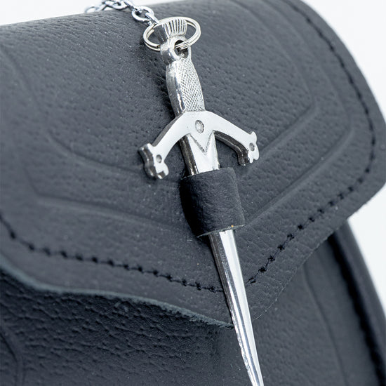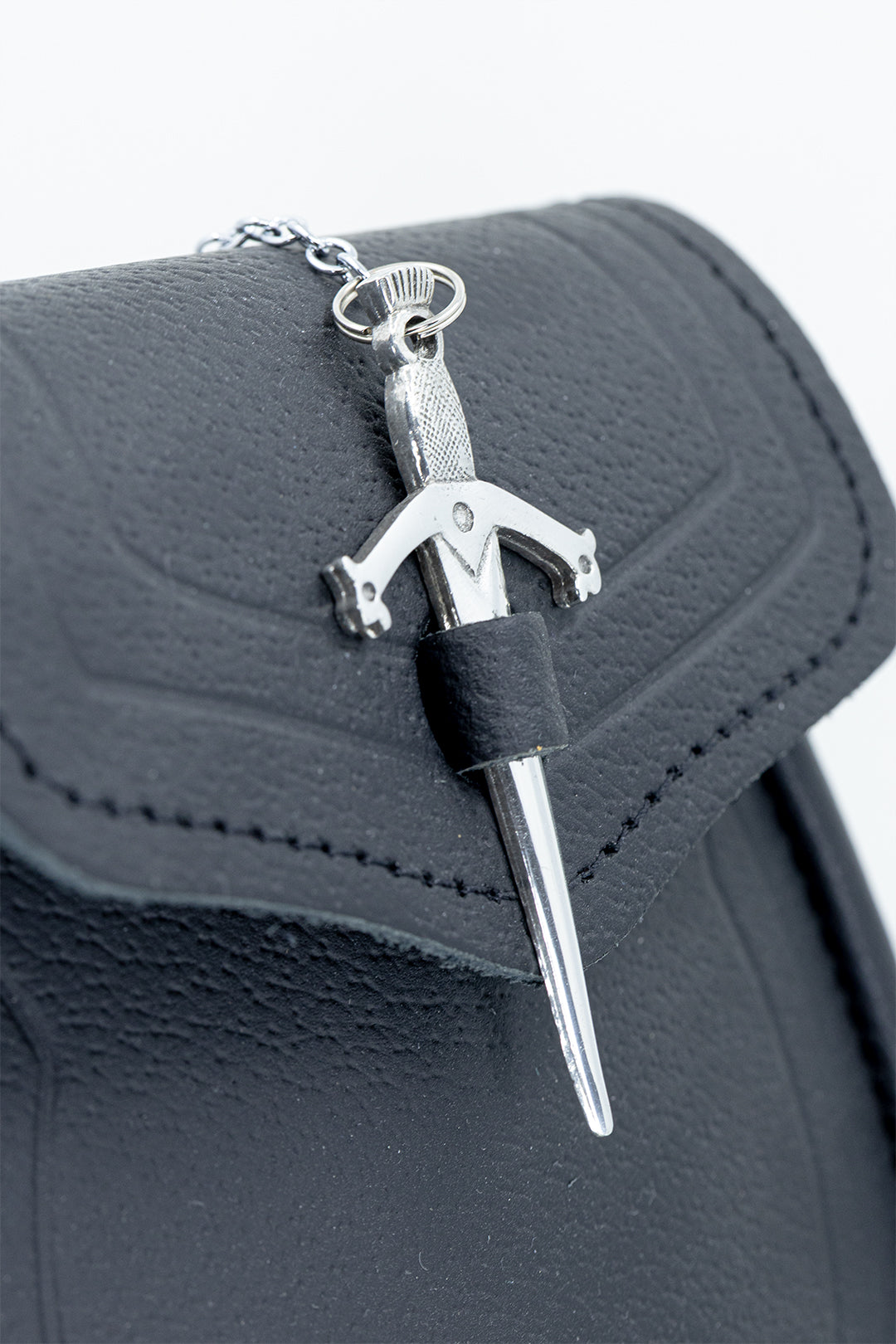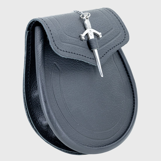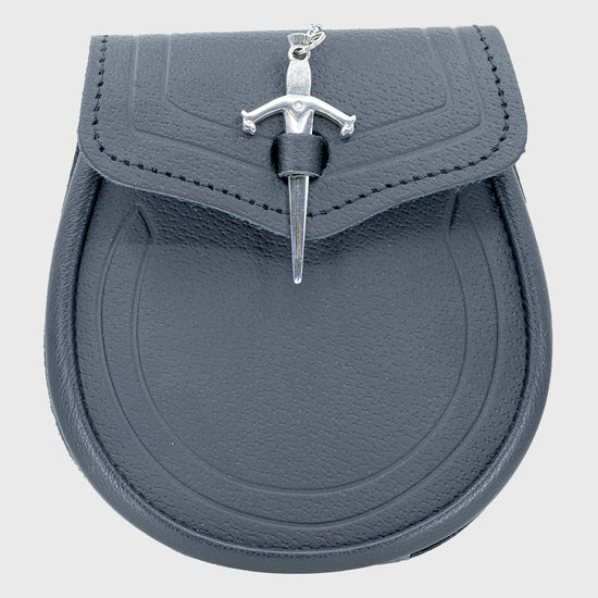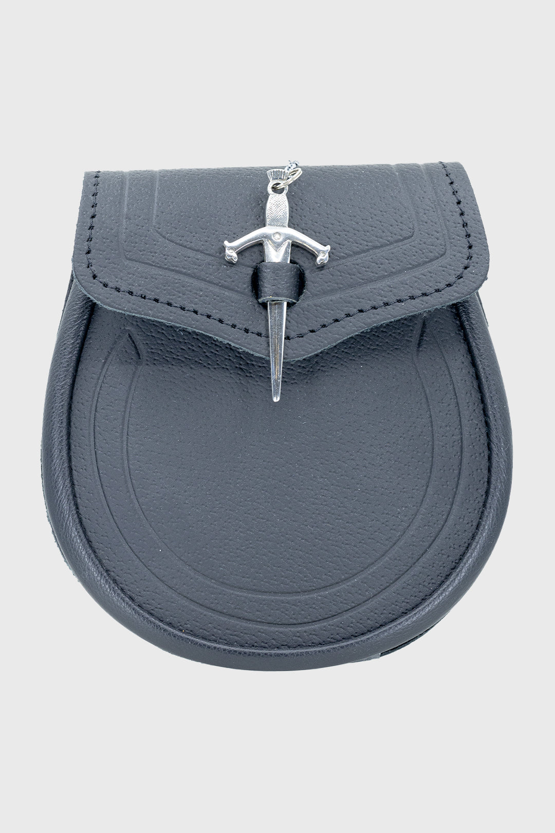 Add a touch of heritage to your Highlandwear with this black leather day sporran, featuring a distinctive sword-shaped closure and a soft black suede lining. Designed for everyday wear, it blends practical function with traditional Scottish style, making it an essential accessory for any kilt outfit.