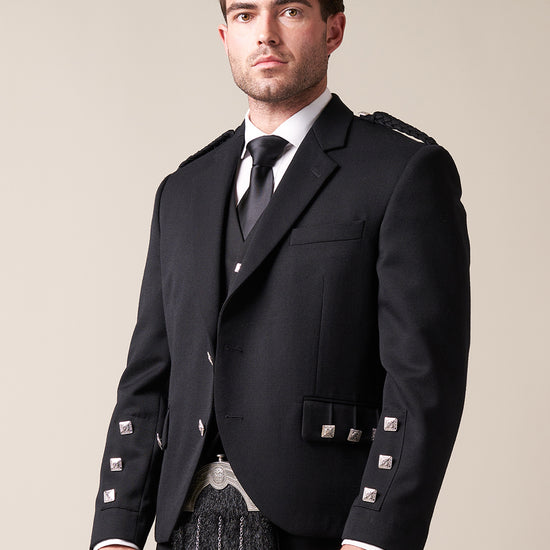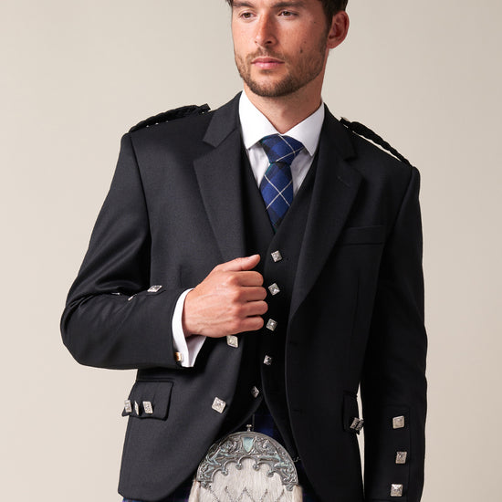 Crafted from 100% Pure Wool, this Black Oban Crail Jacket is a timeless piece that balances both tradition and versatility. Its elegant one-button fastening and matching lapels are elevated by intricately braided epaulettes and polished chrome buttons; which, alongside the sharp, black fabric used in the lining, provide a stylish and refined finish.