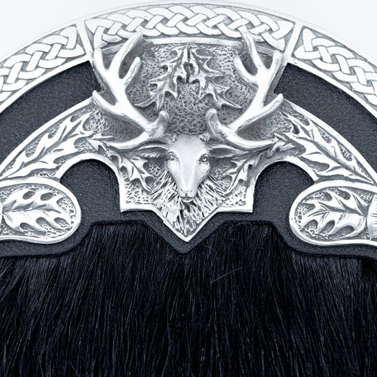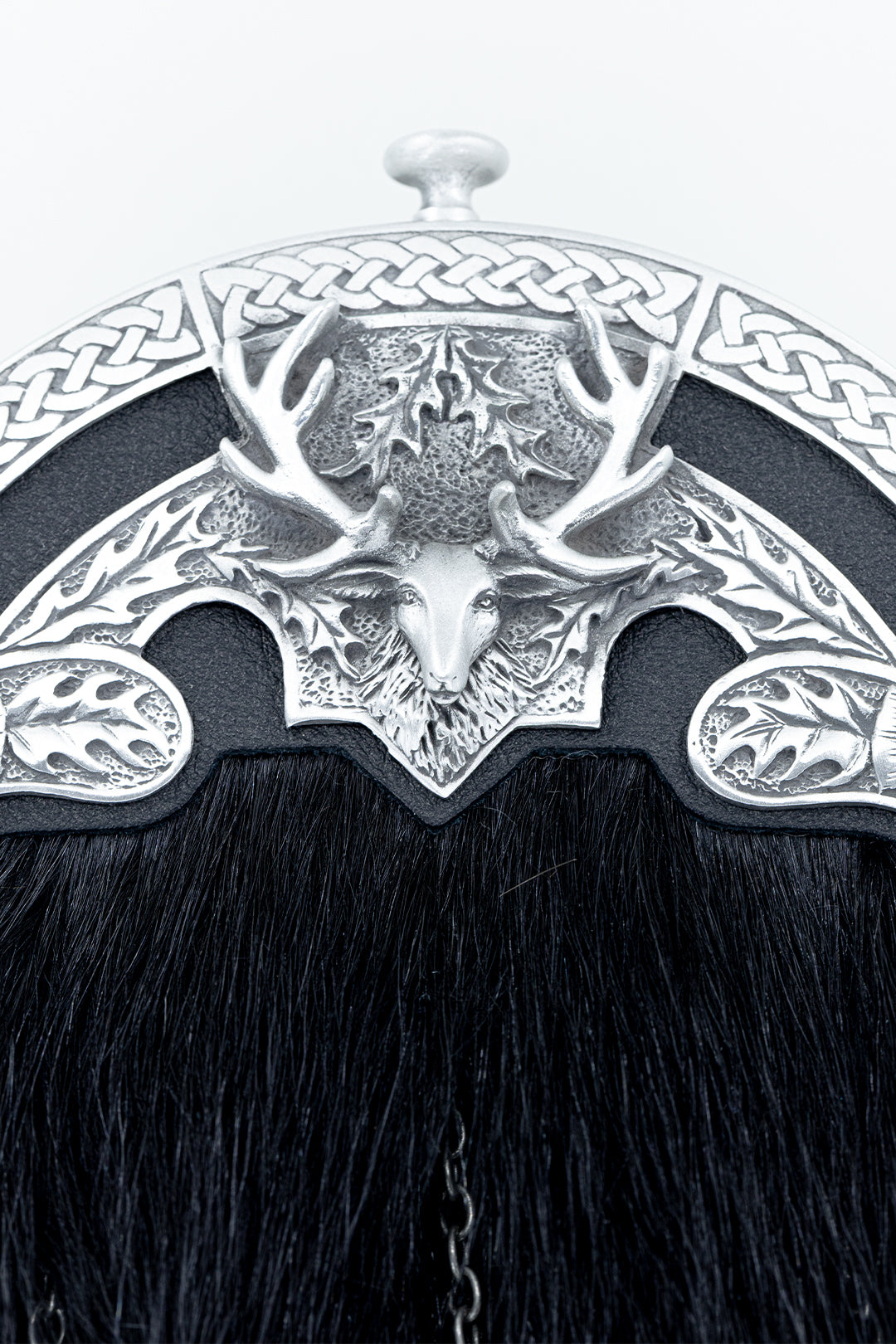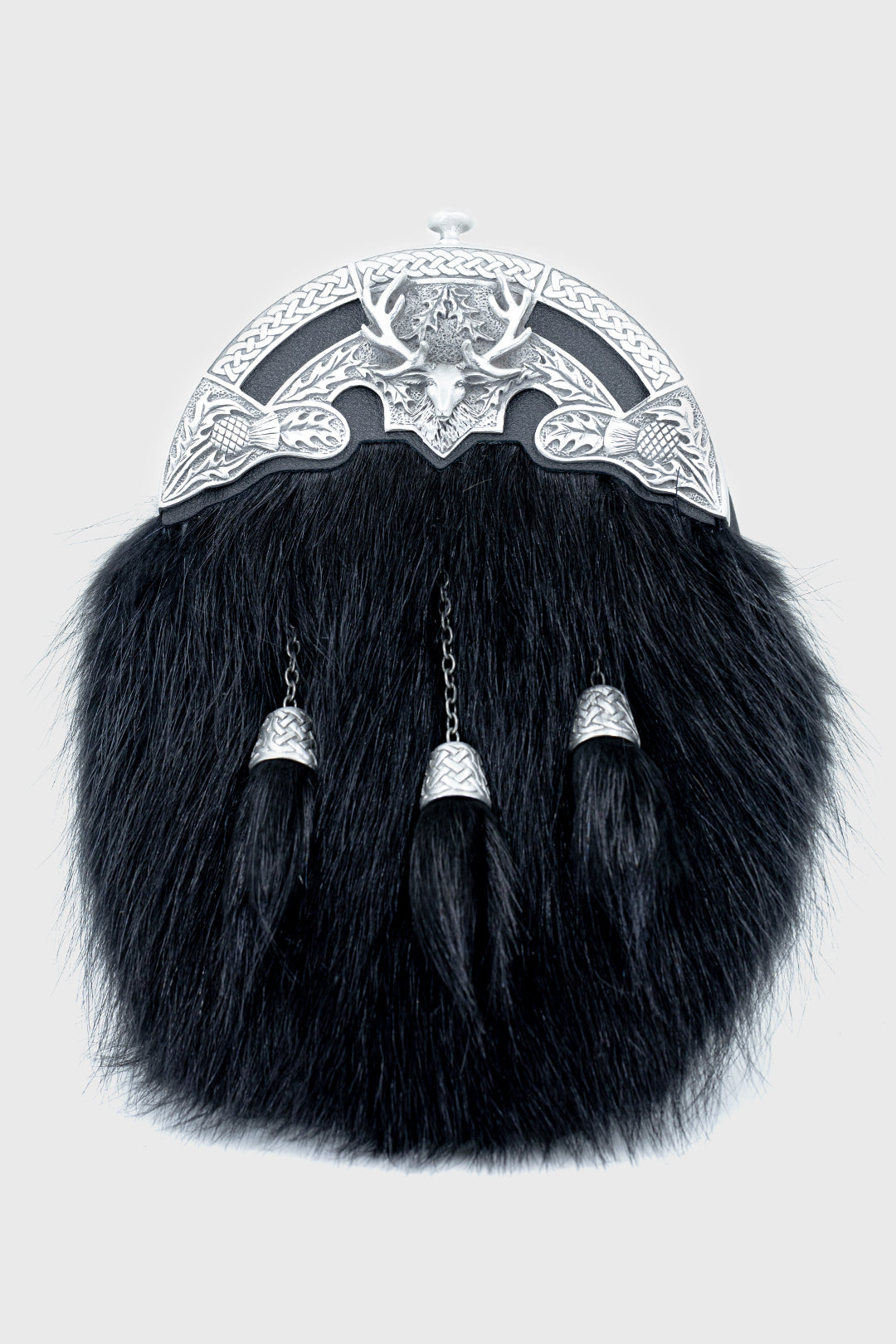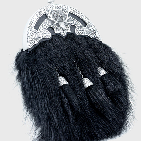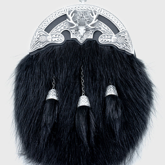 Complete your Highlandwear with this luxurious Black Raccoon Fur Dress Sporran, designed with a detailed stag cantle and finished with a soft grey suede backing for comfort and durability. This elegant sporran features three matching raccoon fur tassels with decorative tops, combining traditional style with superior craftsmanship.