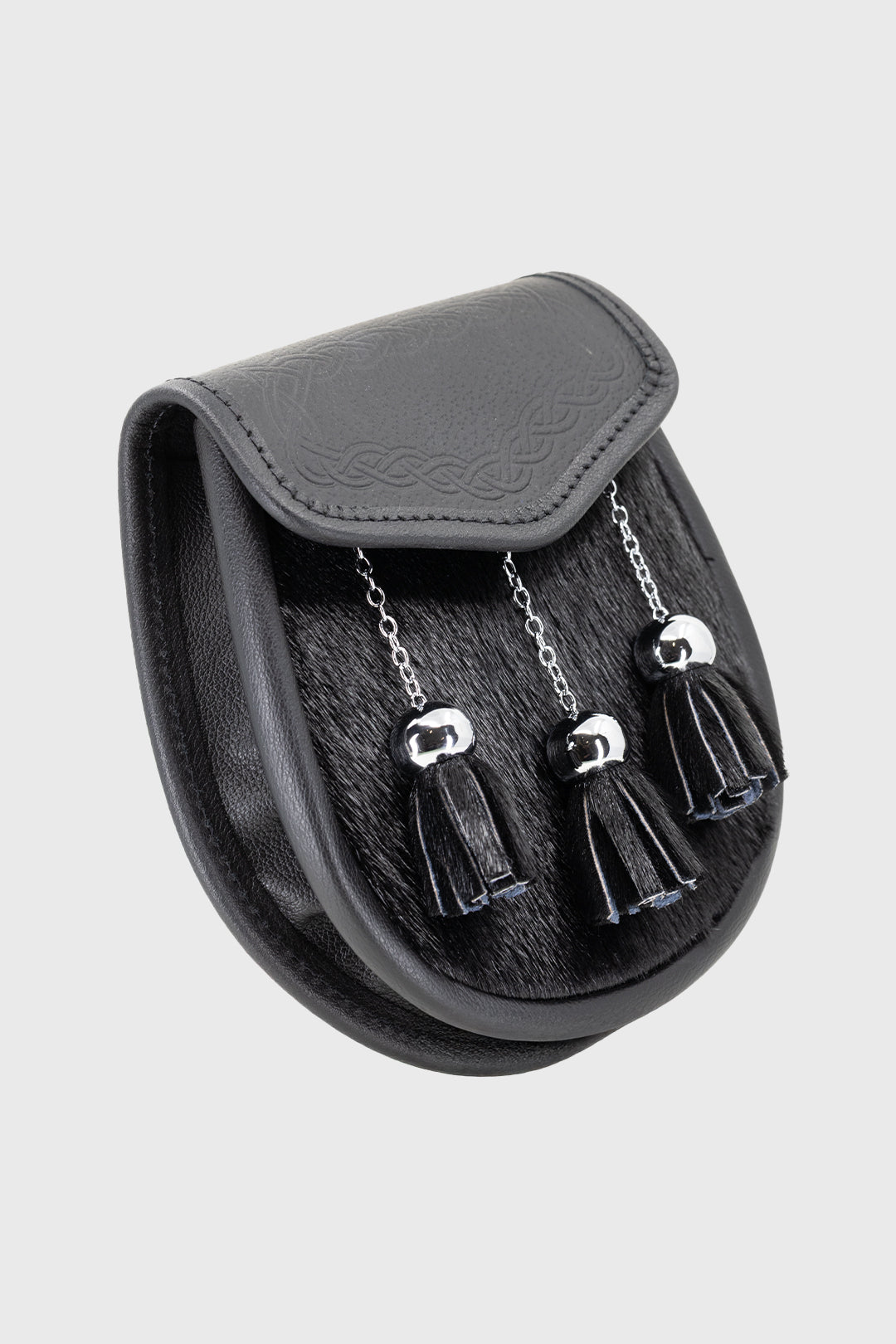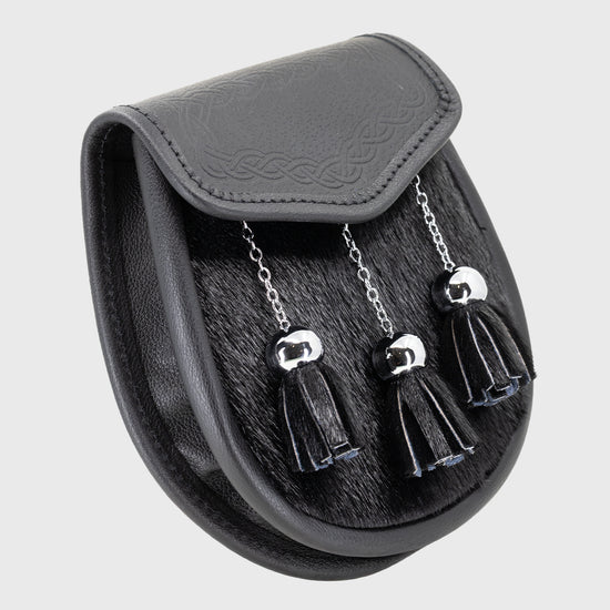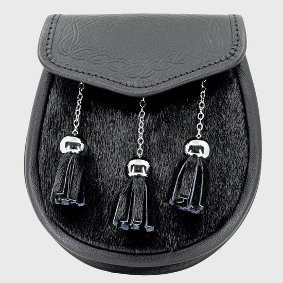 Enhance your Highlandwear with this black leather sealskin semi-dress sporran, featuring laser-etched Celtic detailing and straight tassels for a timeless, authentic look. Handcrafted with traditional techniques, this sporran combines heritage style with practical functionality, making it an ideal accessory for formal and semi-formal occasions.