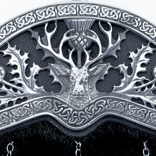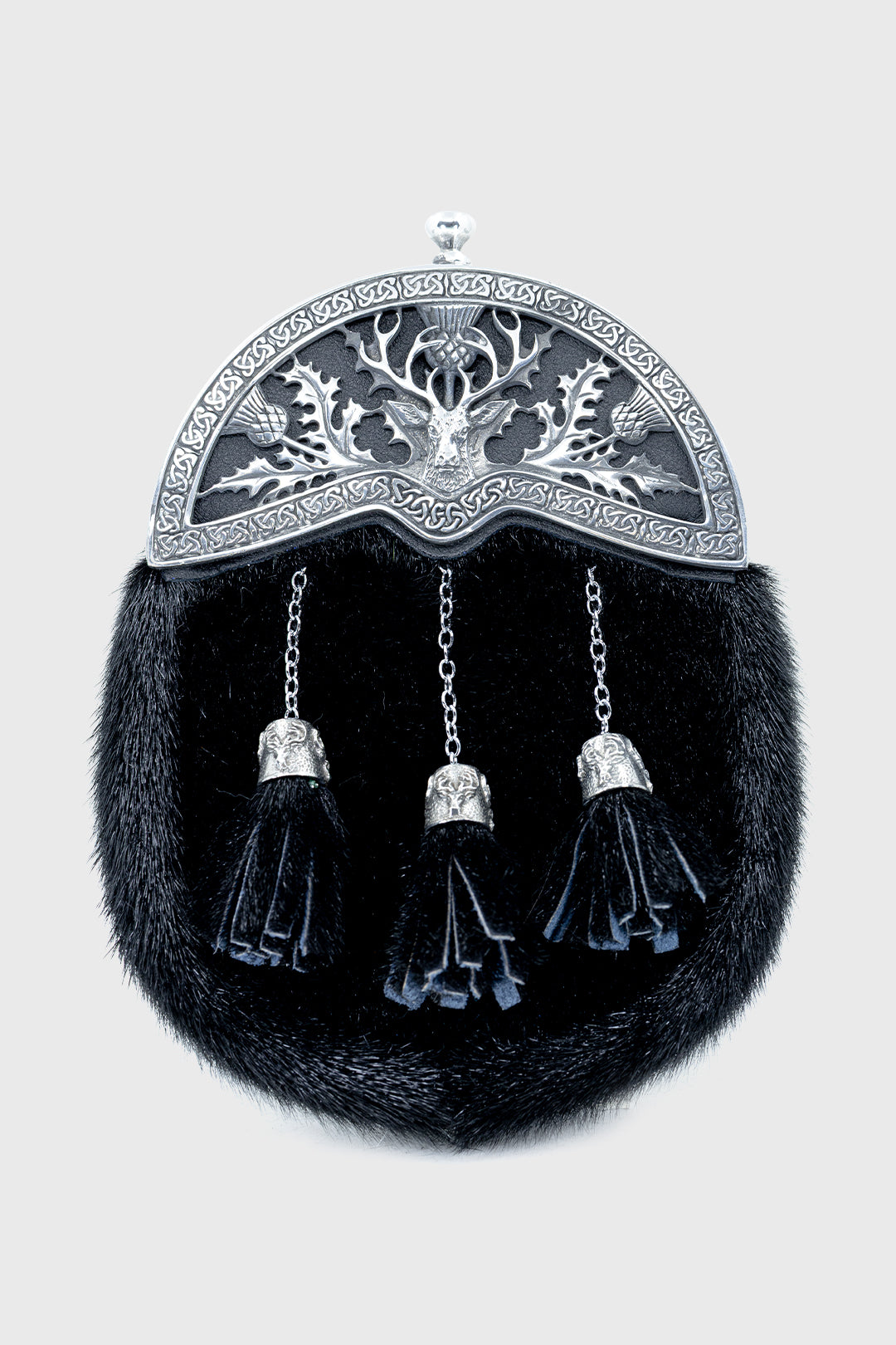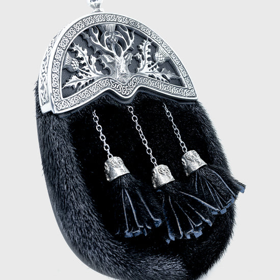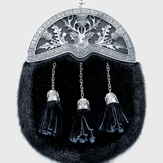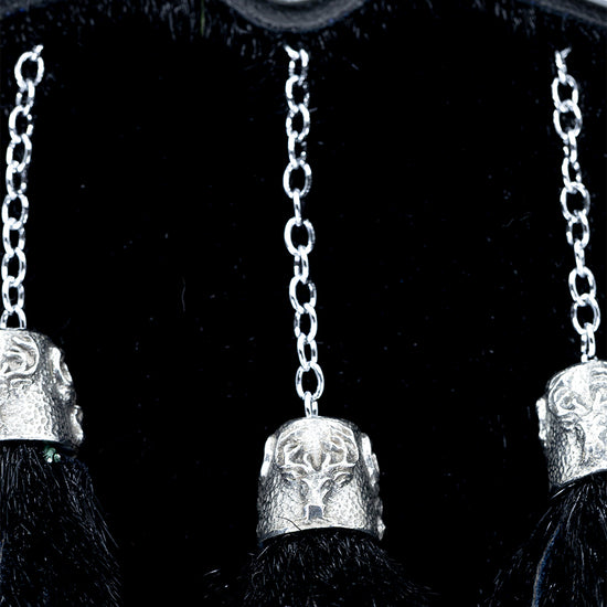 Complete your Highlandwear with this elegant Black Seal Dress Sporran, featuring a finely detailed stag cantle set against a durable black suede backing. Handcrafted in a classic style, it is finished with three matching tassels and decorative tops, making it the perfect accessory for formal Highland dress.
