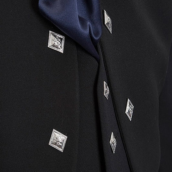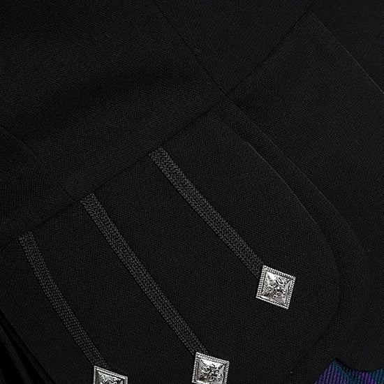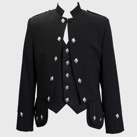 100% pure new wool military style Sherrifmuir jacket and waistcoat set. High collared jacket with one fastening at the top button, braided lapels and diamond shaped chrome buttons, each featuring the Lion Rampant logo. Five button matching straight bottomed waistcoat, with two jetted pockets and Pride of Scotland lining.