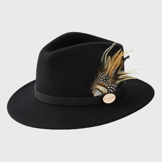 This stunning wool felt Suffolk Fedora will take you from a delightful dog walk to a day at the races with its charm and elegance. Hand finished with a cluster of natural guinea feathers fastened behind a branded leather band.