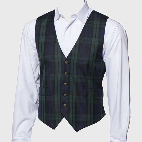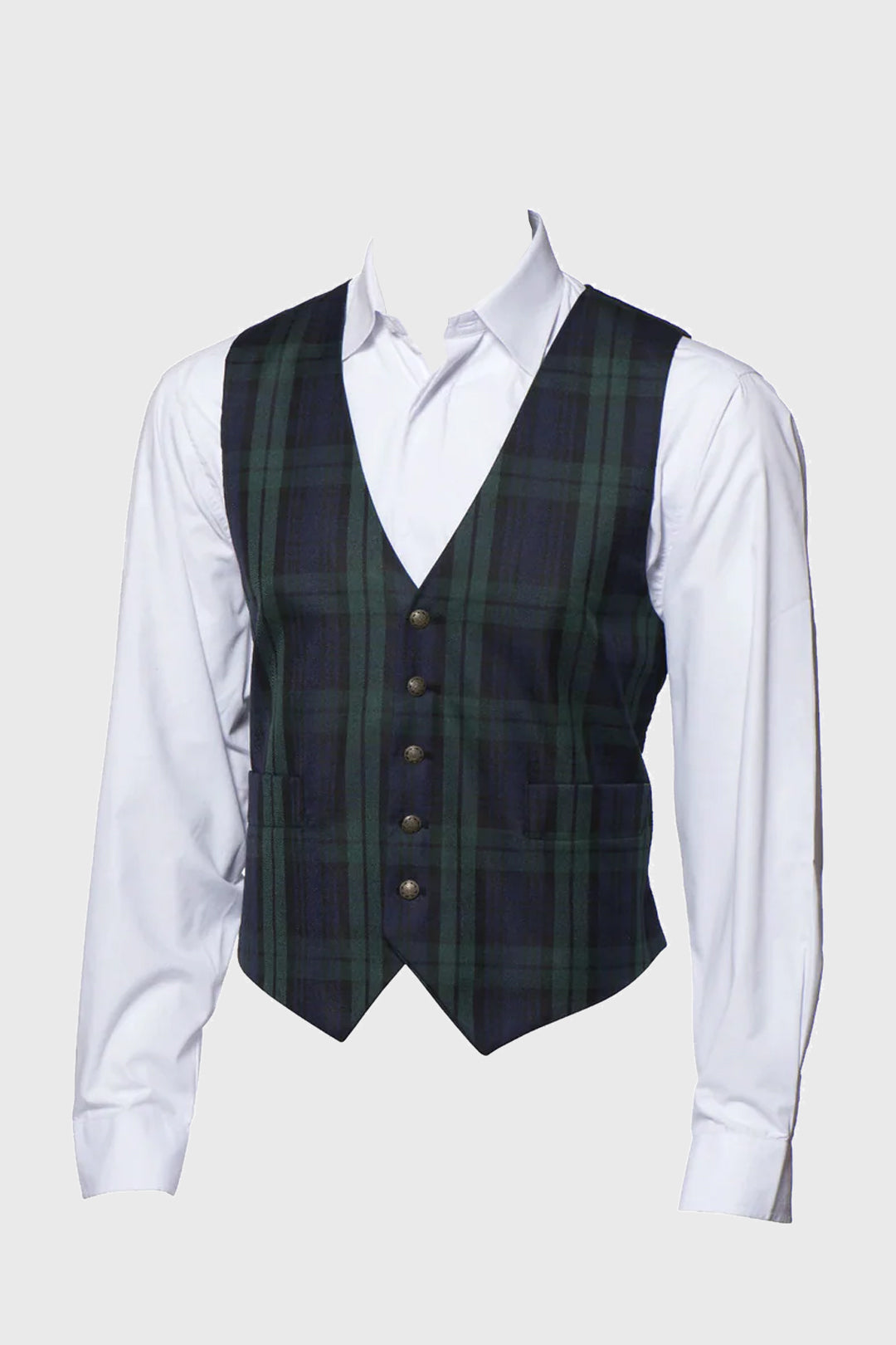 Waistcoat – Two front pockets, 5 antique buttons and waist adjuster on back (Back of waistcoat Plain Black).