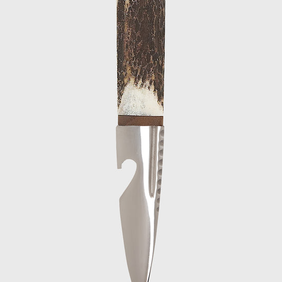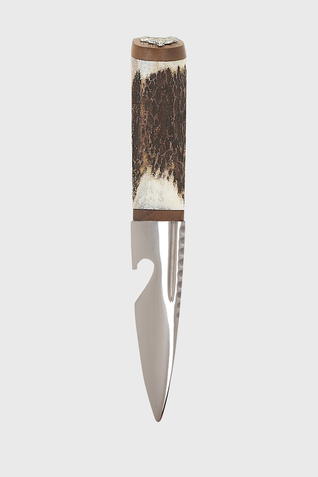 This Daywear Staghorn Sgian Dubh is cleverly designed with a hidden bottle opener. Crafted with a genuine staghorn handle, finished with blackwood detailing and a finely cast pewter silver stag, this piece combines tradition with modern functionality.