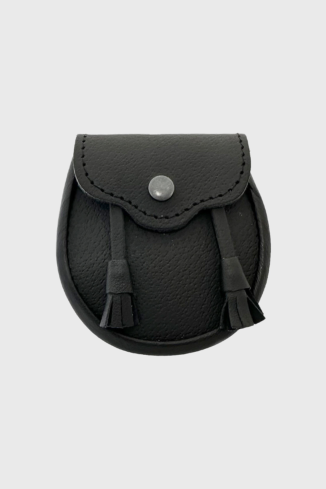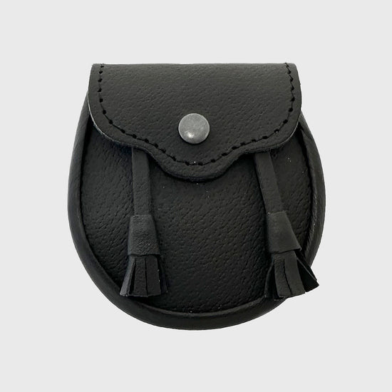 Our boys version of our popular plain black leather day sporran. It features a clasp button to close and two matching tassels.