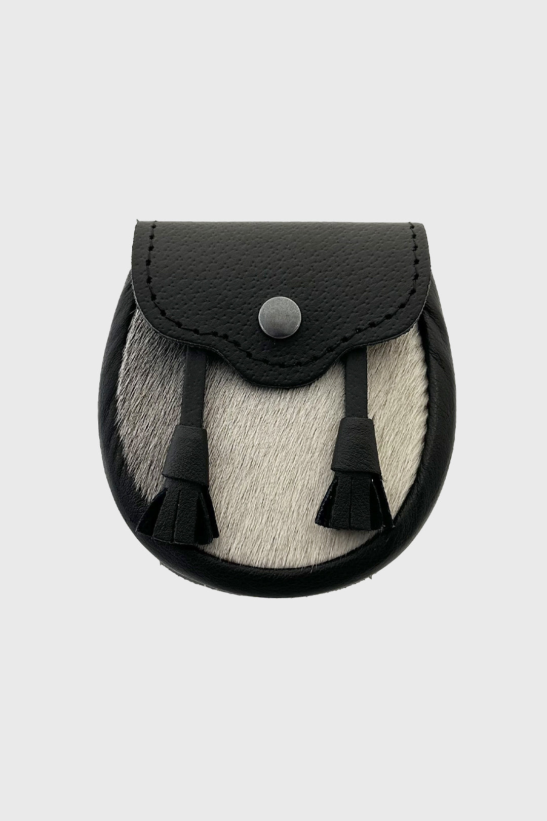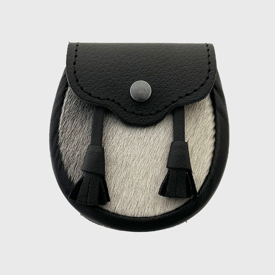 Our boys version of our popularseal & leather semi dress sporran. It features a clasp button to close and matching tassels.
