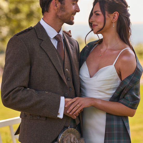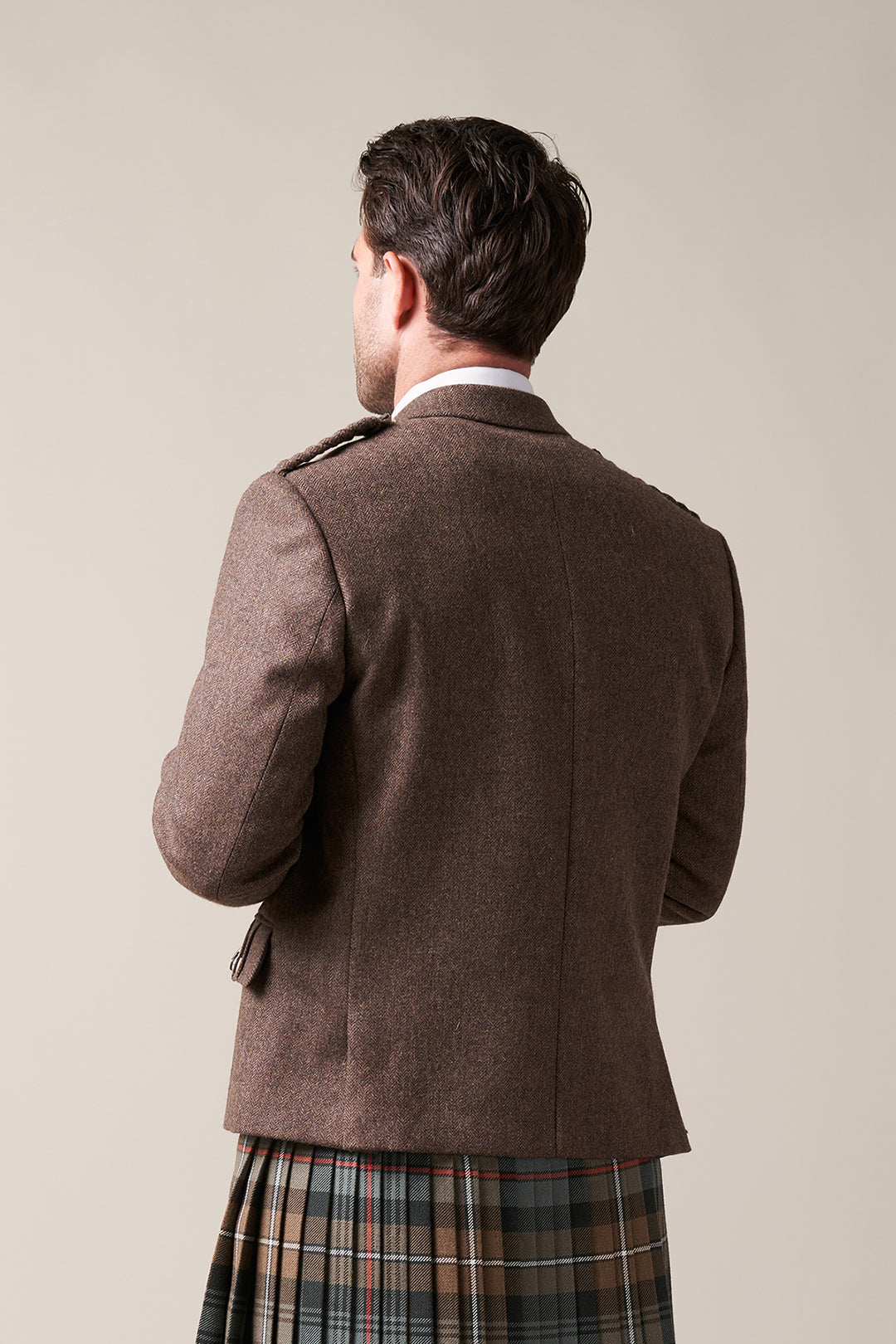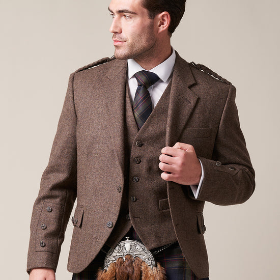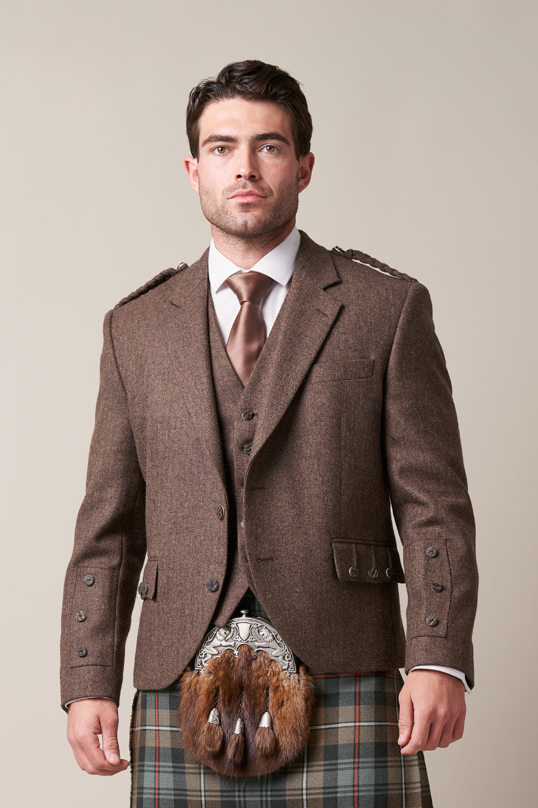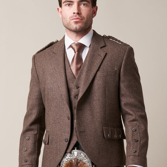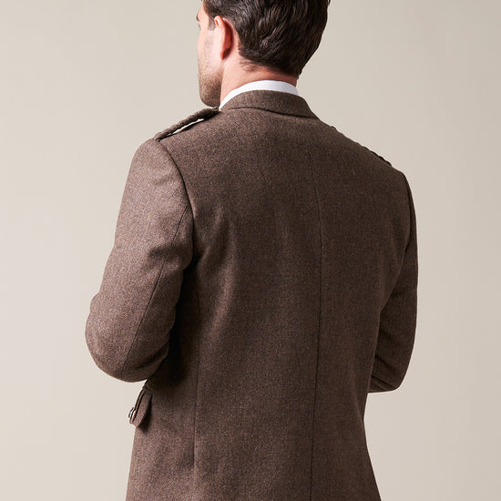 Crafted in Herringbone Tweed, this classic Brown Crail set pairs timeless style with modern refinement. The single-breasted jacket features a smart two-button closure, which is complemented by a matching, sleek five-button waistcoat. Faux hornback buttons add a distinctive touch, while the waistcoat back and linings are finished in a sharp, brown fabric, for a polished, cultured look.