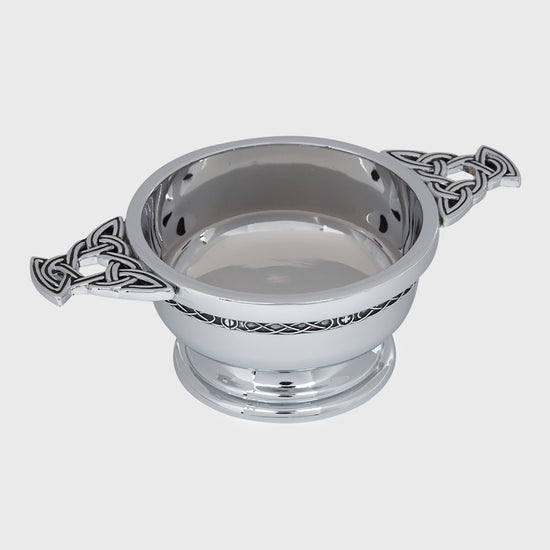 A beautifully finished 3" chrome-plated quaich, decorated with a traditional Celtic design that symbolises unity and heritage. Supplied in a presentation box, it makes a thoughtful gift or lasting keepsake. The word quaich comes from the Gaelic cuach, meaning “shallow cup” — long cherished in Scotland as the symbolic cup of friendship.