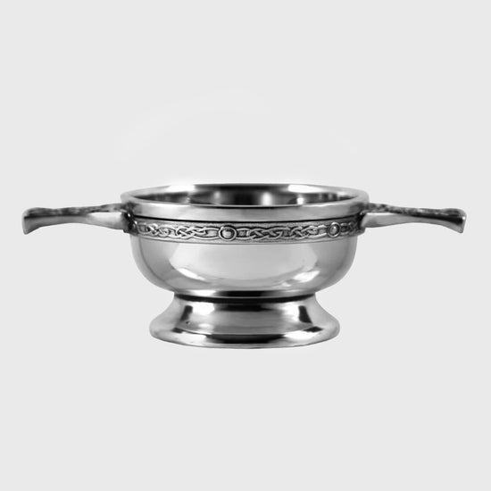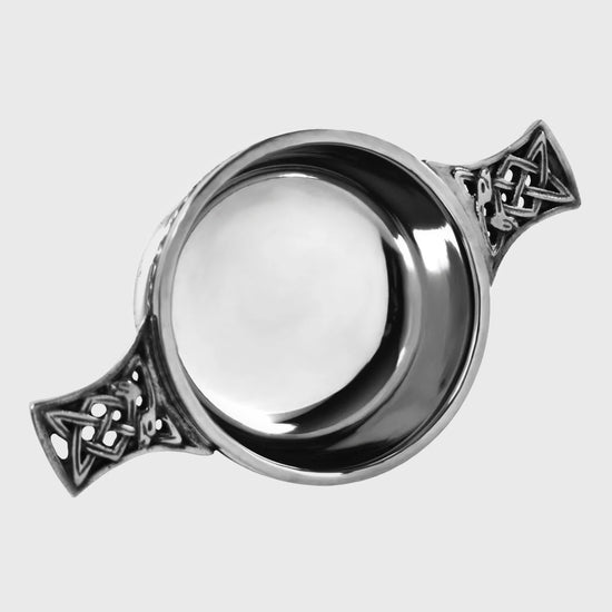 Gracefully polished and adorned with flowing Celtic knot handles, this quaich carries with it the spirit of kinship and shared moments. Its timeless design makes it a heartfelt gift or keepsake, a symbol of warmth and friendship passed from hand to hand.