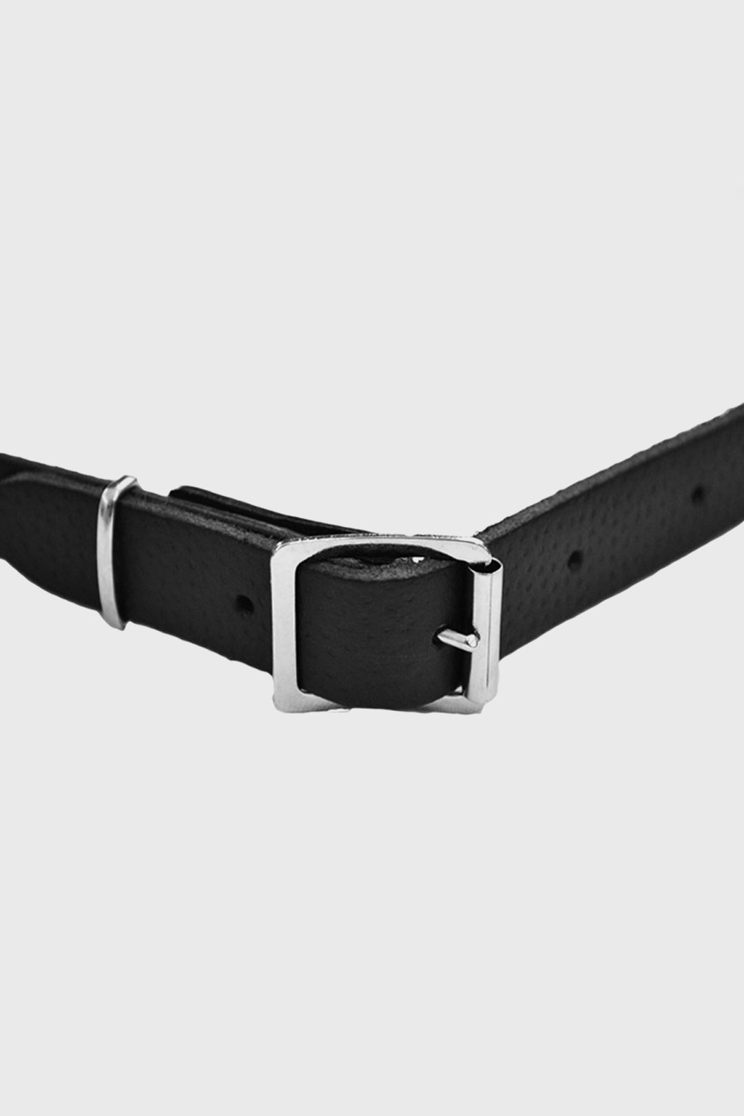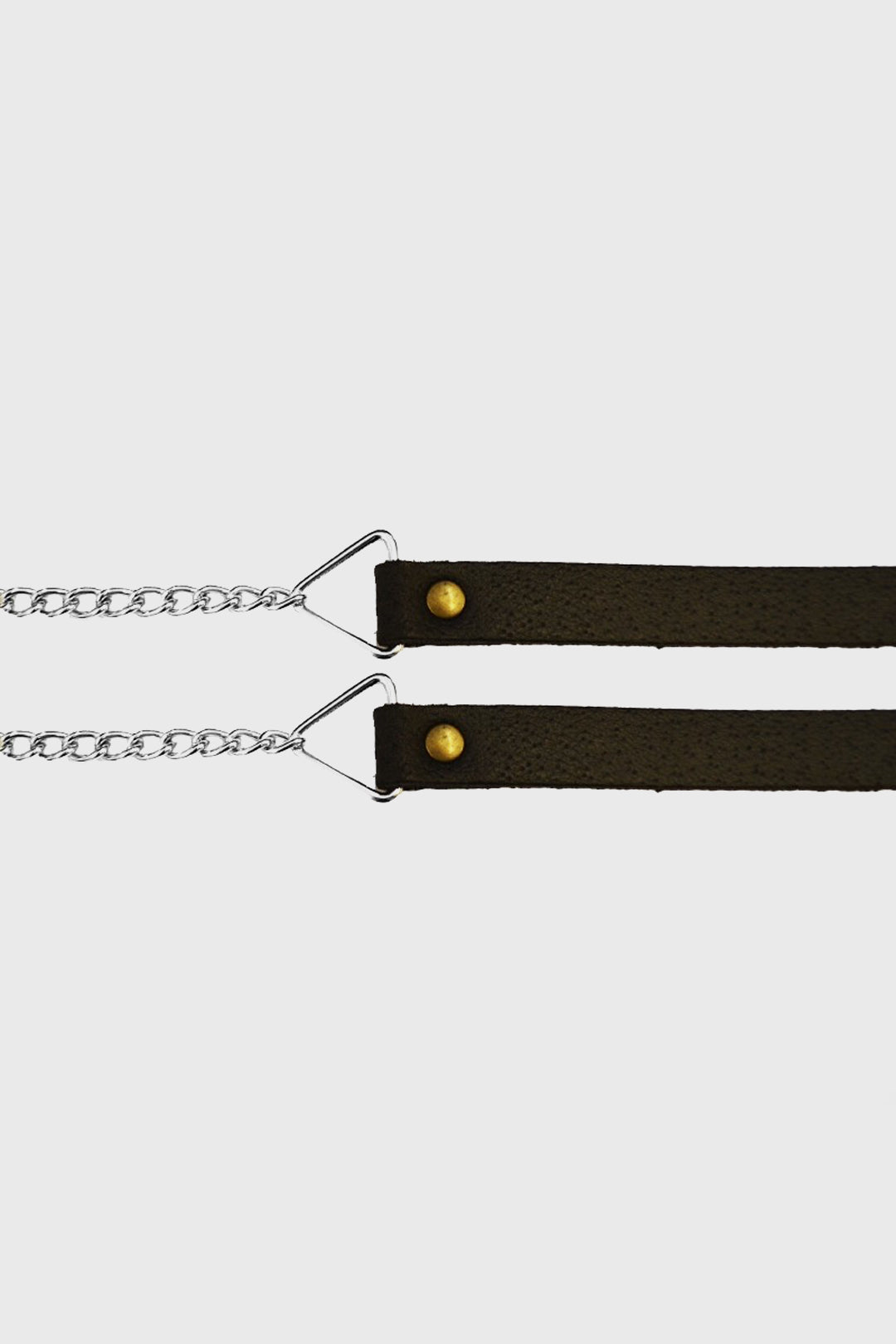 Black leather strap with a chrome finished chain.