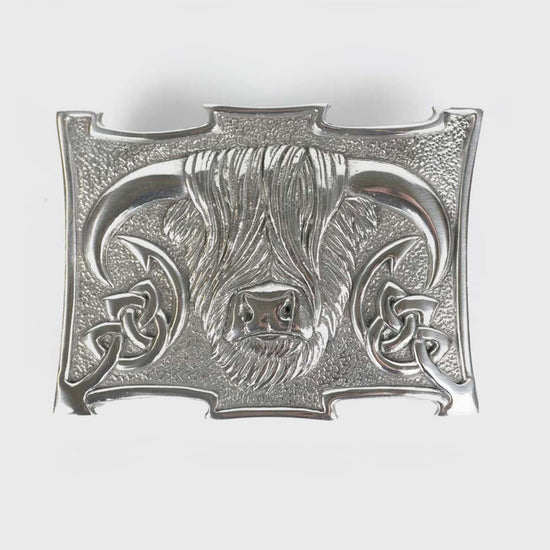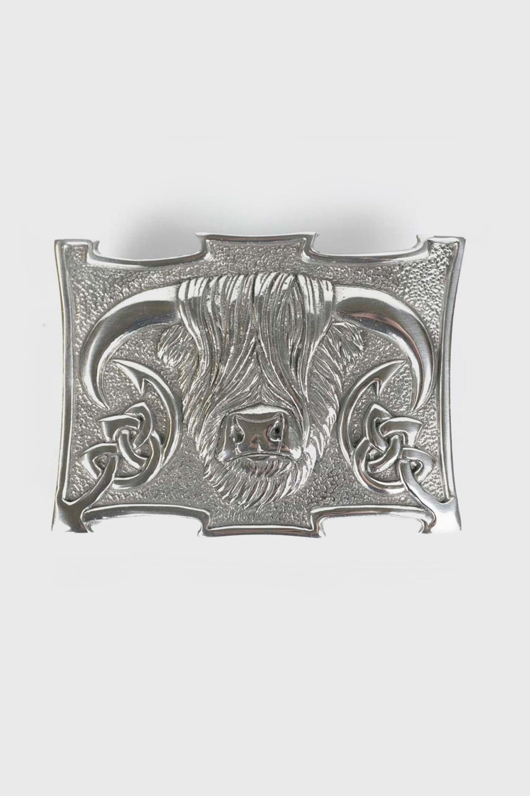Polished pewter kilt belt buckle with large highland coo head, and Celtic detailing in corners.