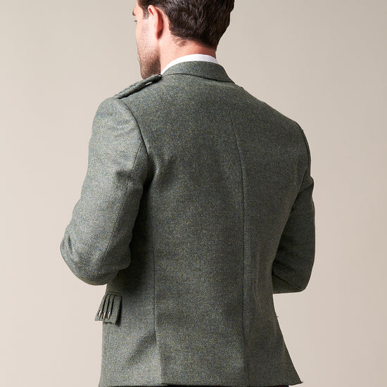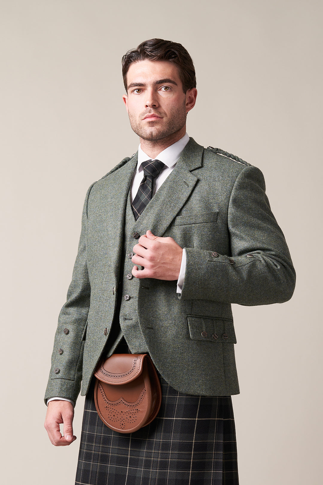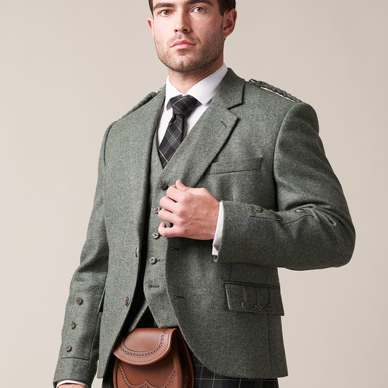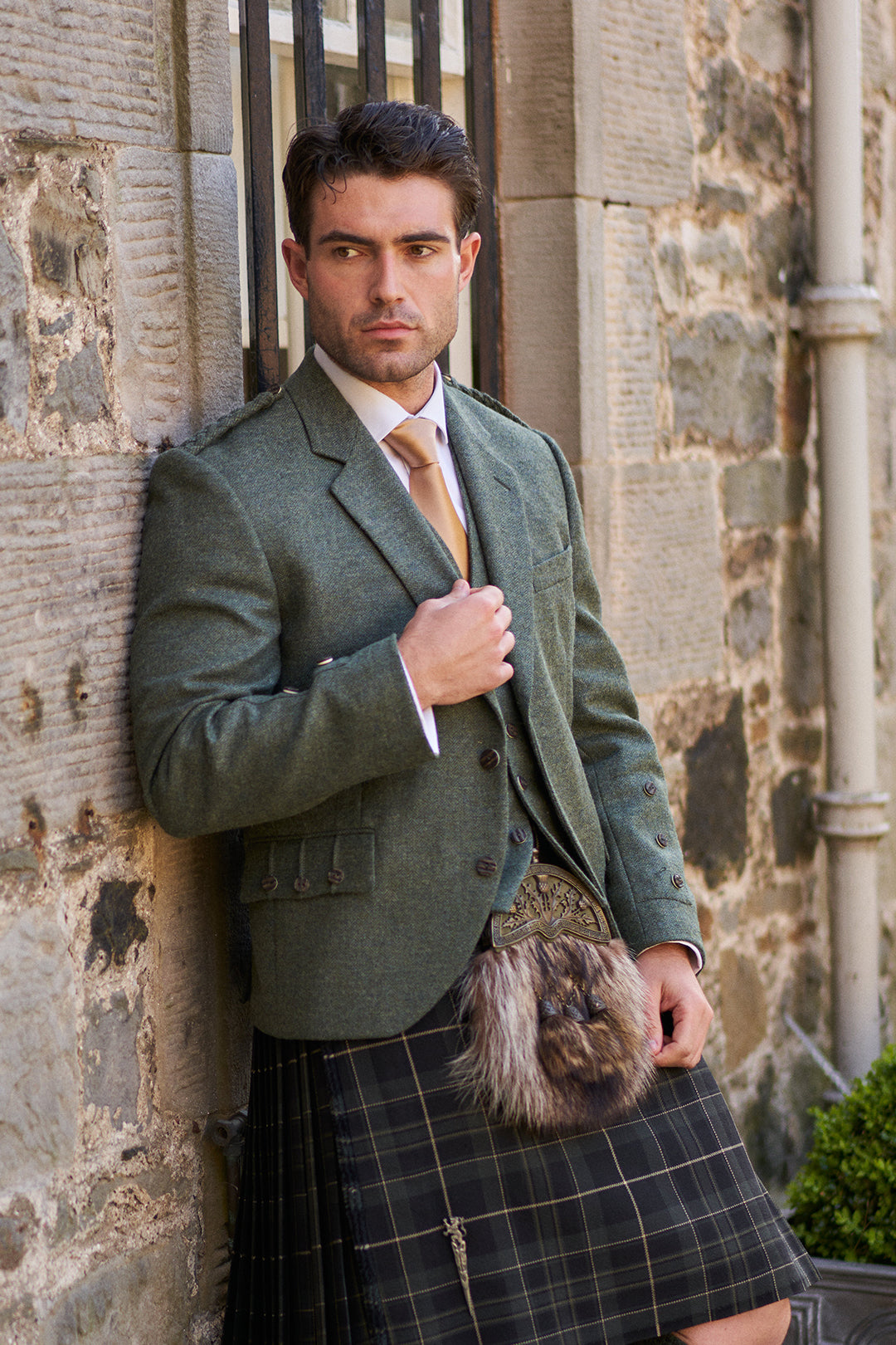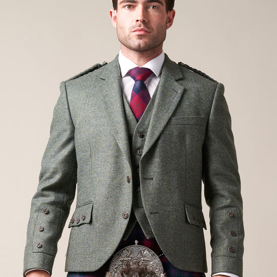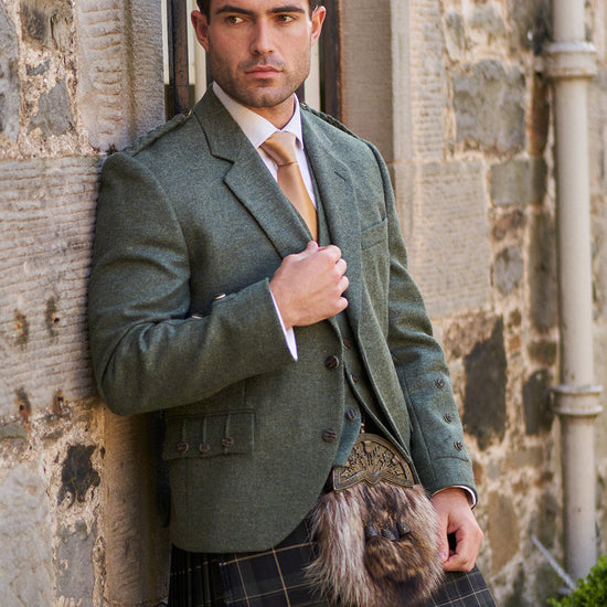 Crafted in Herringbone Tweed, this classic Dark Green Crail set pairs timeless style with modern refinement. The single-breasted jacket features a smart two-button closure, which is complemented by a matching, sleek five-button waistcoat. Faux hornback buttons add a distinctive touch, while the waistcoat back and linings are finished in a sharp, dark green fabric, for a polished, cultured look.