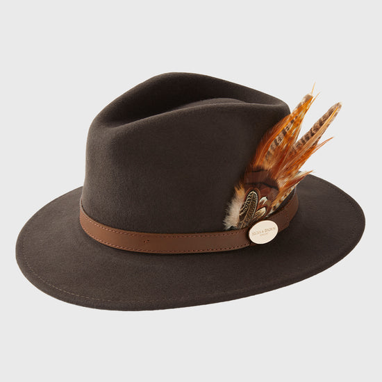 A rich, earthy shade reminiscent of polished chestnut wood, this dark brown offers timeless versatility. Perfectly at home, in the field or the city, it adds depth and warmth to any outfit.Each hat is fully lined and finished with a leather headband inside.