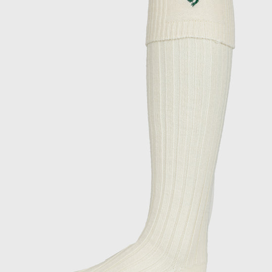 Ecru Merino wool blend kilt socks (hose) with a classic rib design and green rampant lion motif.
