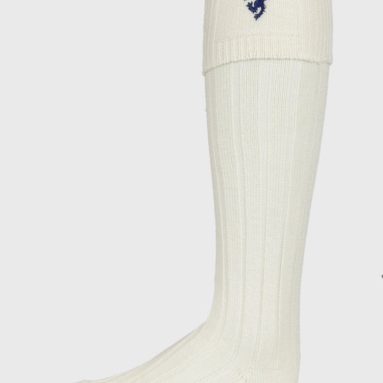 Ecru Merino wool blend kilt socks (hose) with a classic rib design and navy blue rampant lion motif.