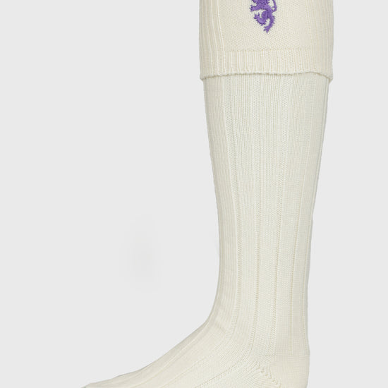Ecru Merino wool blend kilt socks (hose) with a classic rib design and purple rampant lion motif.