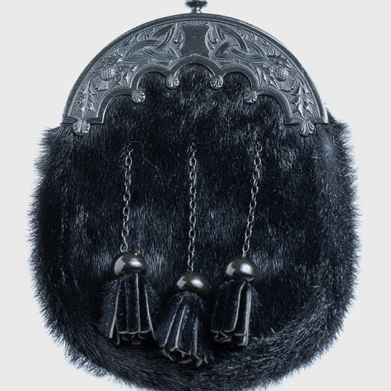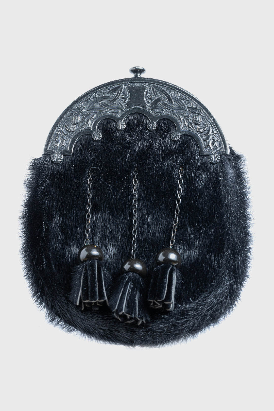 Black Dress Sporran featuring a black cantle, and straight chains with matching ball tassles.