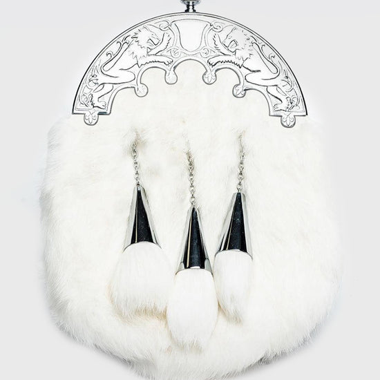 This White Rabbit Dress Sporran is a luxurious Highland accessory, handcrafted from premium leather and finished with soft rabbit fur for an elegant and distinguished look. Featuring a detailed Pride of Scotland lion rampant cantle and three straight chains with matching cone top tassels, it is designed to complement formal kilt attire at weddings, ceilidhs, and special occasions. Combining traditional craftsmanship with timeless Scottish style, this sporran is both a statement piece and a practical addition to any dress outfit.