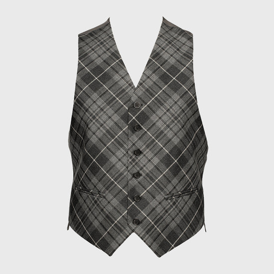 A cut on the cross Granite Pride tartan waistcoat with 6 buttons and 2 low jetted pockets. This item is to be worn with high-rise waisted trews or a kilt.