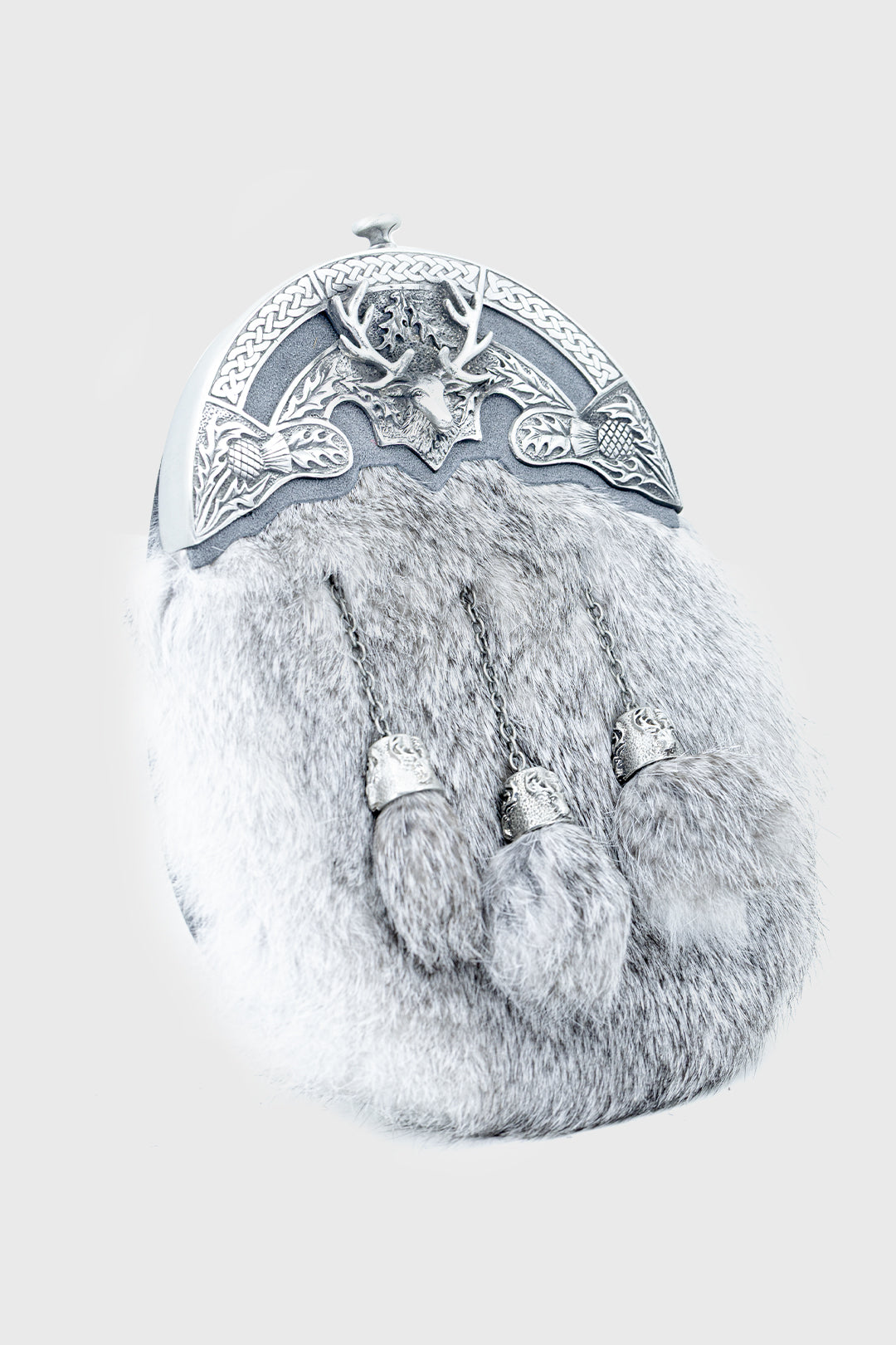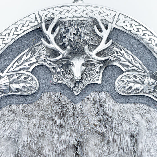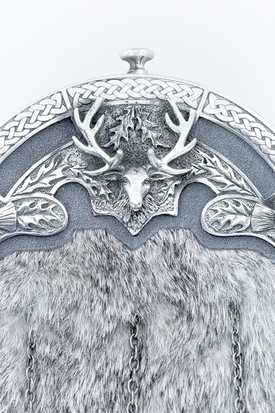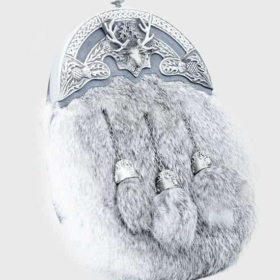 Handcrafted from soft grey chinchilla fur, this distinguished dress sporran features a finely detailed stag-design cantleset against a grey suede backing for added depth and contrast. Three matching tassels with complementing tops complete its traditional Highland look, making it a perfect choice for weddings, formal occasions, and ceremonial gatherings.