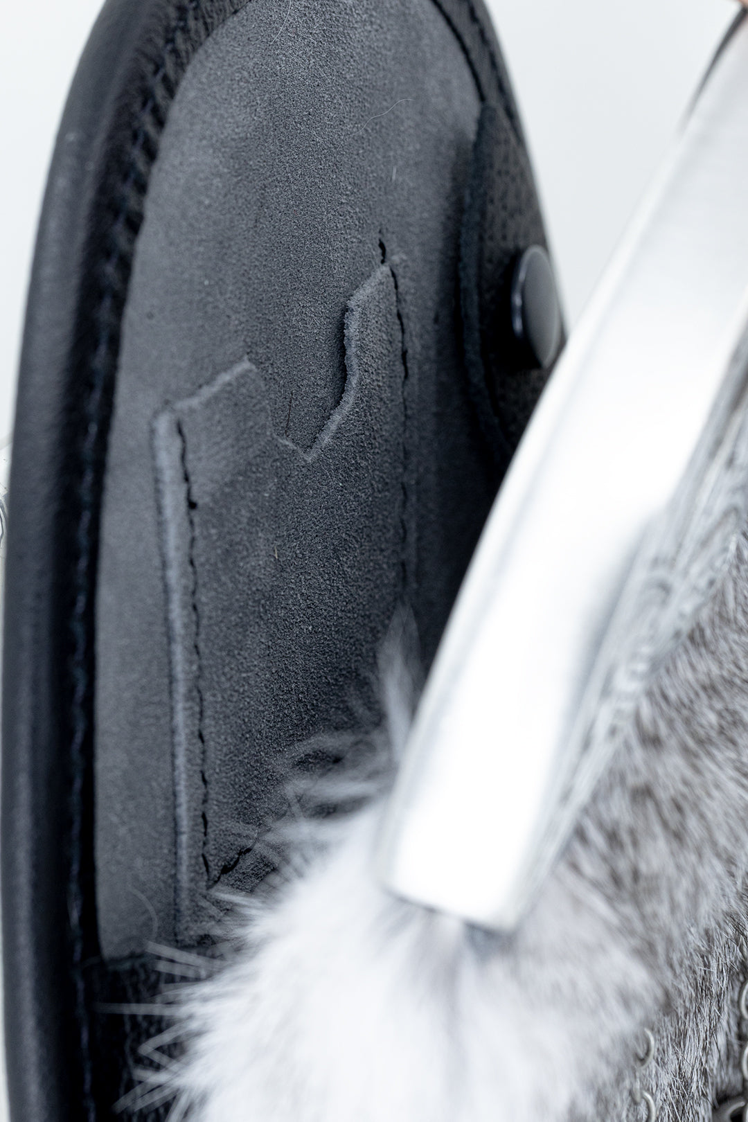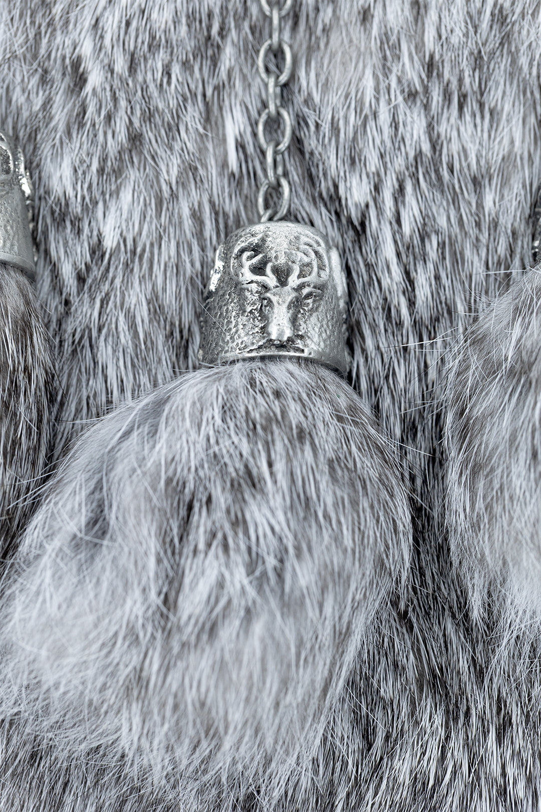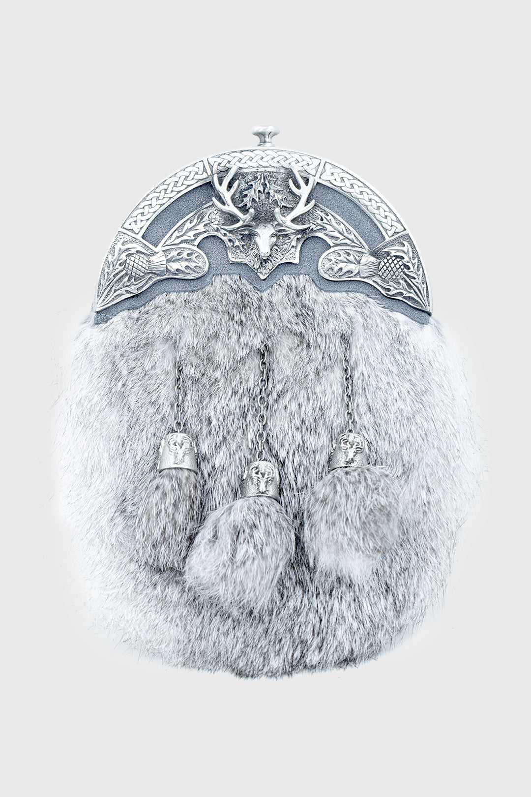 Handcrafted from soft grey chinchilla fur, this distinguished dress sporran features a finely detailed stag-design cantleset against a grey suede backing for added depth and contrast. Three matching tassels with complementing tops complete its traditional Highland look, making it a perfect choice for weddings, formal occasions, and ceremonial gatherings.