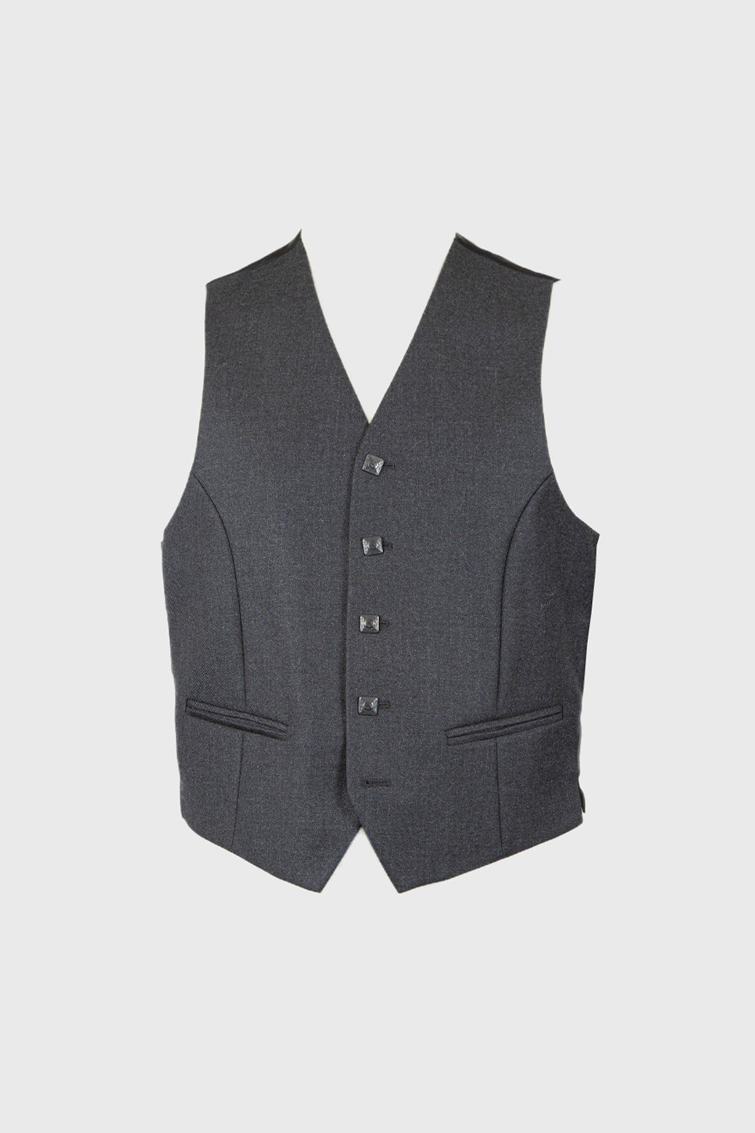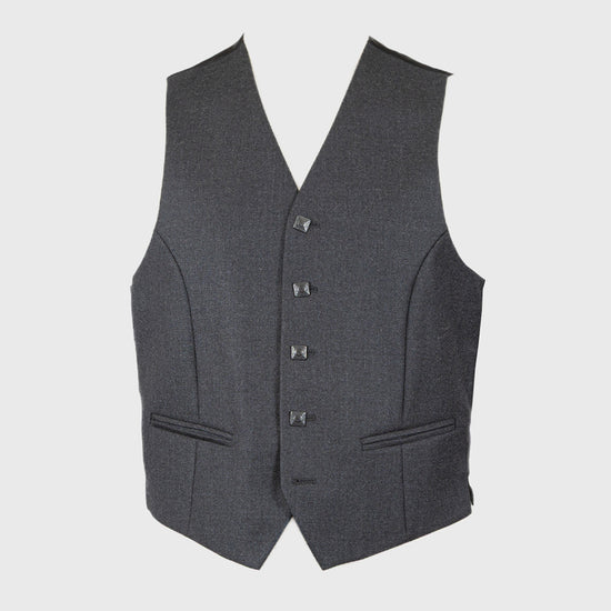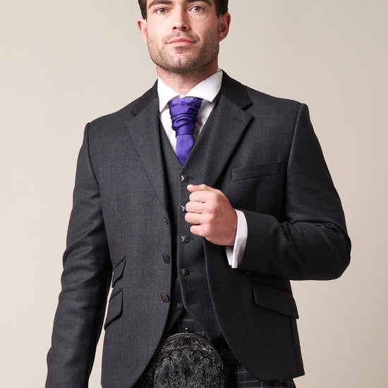 Crafted in rich, Dark Grey Wool, this classic Grey Edwardian set pairs timeless style with modern refinement. The single-breasted jacket, with black detail on the lapels, features a smart two-button closure, which is complemented by a matching, sleek five-button waistcoat. Traditional black, square buttons add a distinctive touch, while the waistcoat back and linings are finished in a sharp, dark grey/silver fabric.