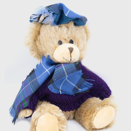 Cute Scottish teddy bear dressed in Ancient Pride of Scotland tartan with scarf, hat, and complementing jumper. Perfect gift or keepsake.