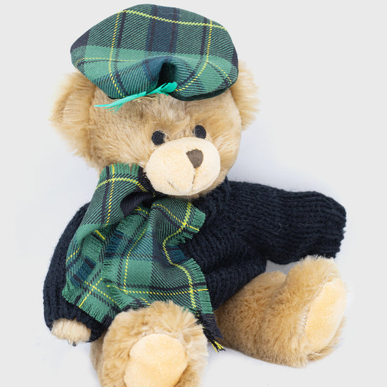 Cute Scottish teddy bear dressed in Irish Pride tartan scarf and hat, plus complementing jumper. Perfect gift or keepsake.