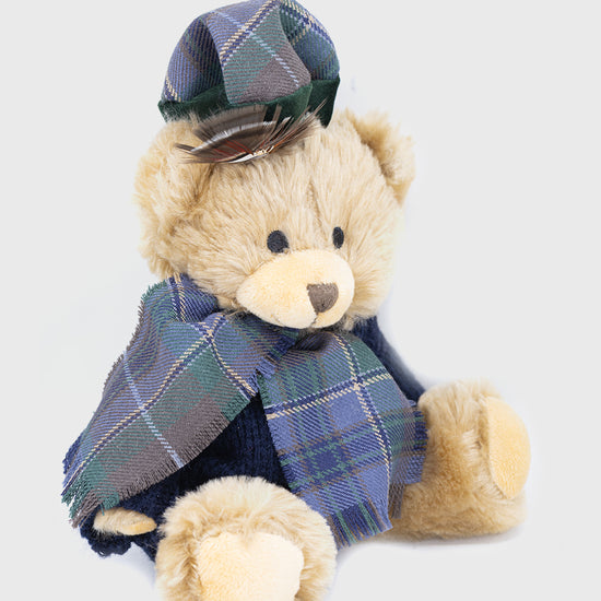 Cute Scottish teddy bear dressed in Weathered Pride of Scotland tartan scarf and hat, plus complementing jumper. Perfect gift or keepsake.