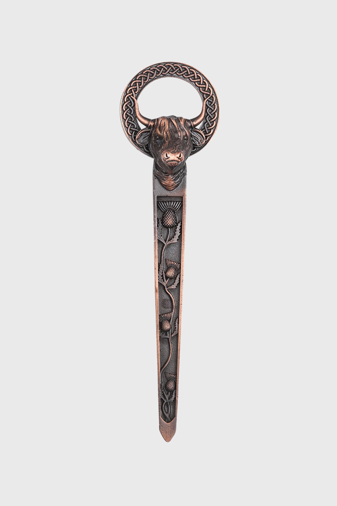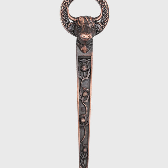 This beautifully handcrafted Highland Cow and Thistle kilt pin is made in Britain from high-quality pewter. Featuring an elegant thistle motif that rises from the base and a finely detailed Highland cow’s head framed in intricate Celtic knotwork, this unique design is a true tribute to Scotland’s natural beauty and cultural spirit. Each kilt pin is handcrafted and available in Copper, Antique and Polished finishes