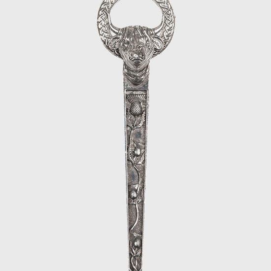 This beautifully handcrafted Highland Cow and Thistle kilt pin is made in Britain from high-quality pewter. Featuring an elegant thistle motif that rises from the base and a finely detailed Highland cow’s head framed in intricate Celtic knotwork, this unique design is a true tribute to Scotland’s natural beauty and cultural spirit. Each kilt pin is handcrafted and available in Copper, Antique and Polished finishes