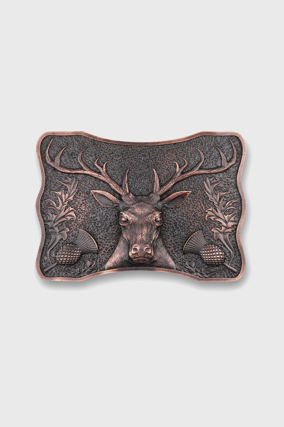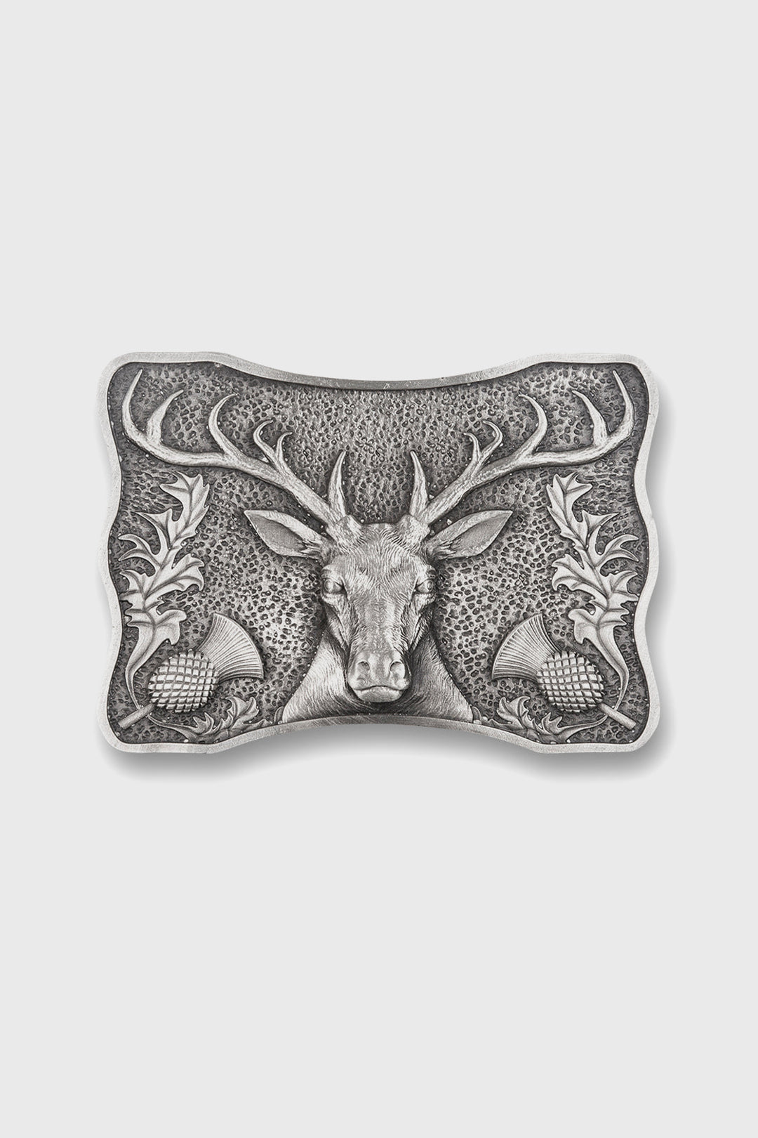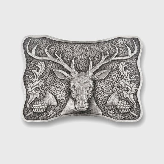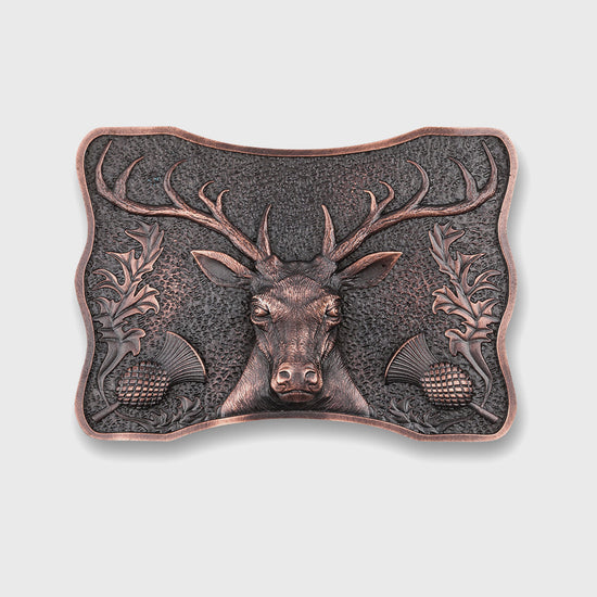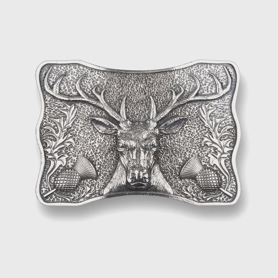 Embody the essence of the Scottish Highlands with our Pewter Kilt Belt Buckle, featuring a majestic Highland Stag at its centre, surrounded by the rugged beauty of Thistles at its edges. This splendid piece of craftsmanship is designed and made with pride in Britain, tailored to fit a standard 55mm wide kilt belt. With a choice of three elegant finishes—Polished, Matt, and Chocolate Bronze—this buckle is a versatile accessory that complements any traditional Scottish attire, offering a nod to Scotland's wild, natural landscape and rich heritage.