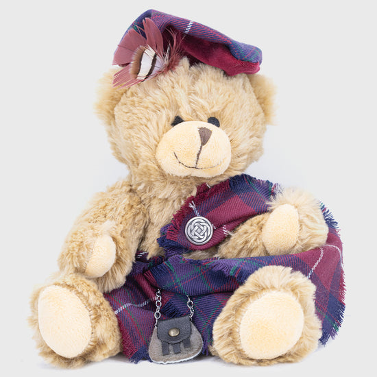 Highlander teddy bear in National Pride of Scotland tartan kilt, plaid, hat, with sporran. A perfect Highland gift or Scottish souvenir.