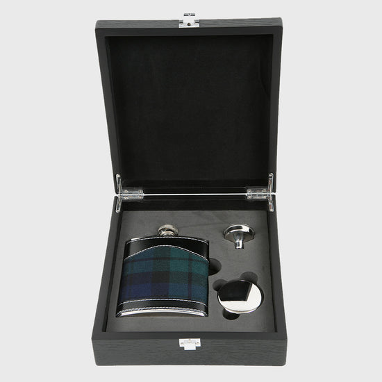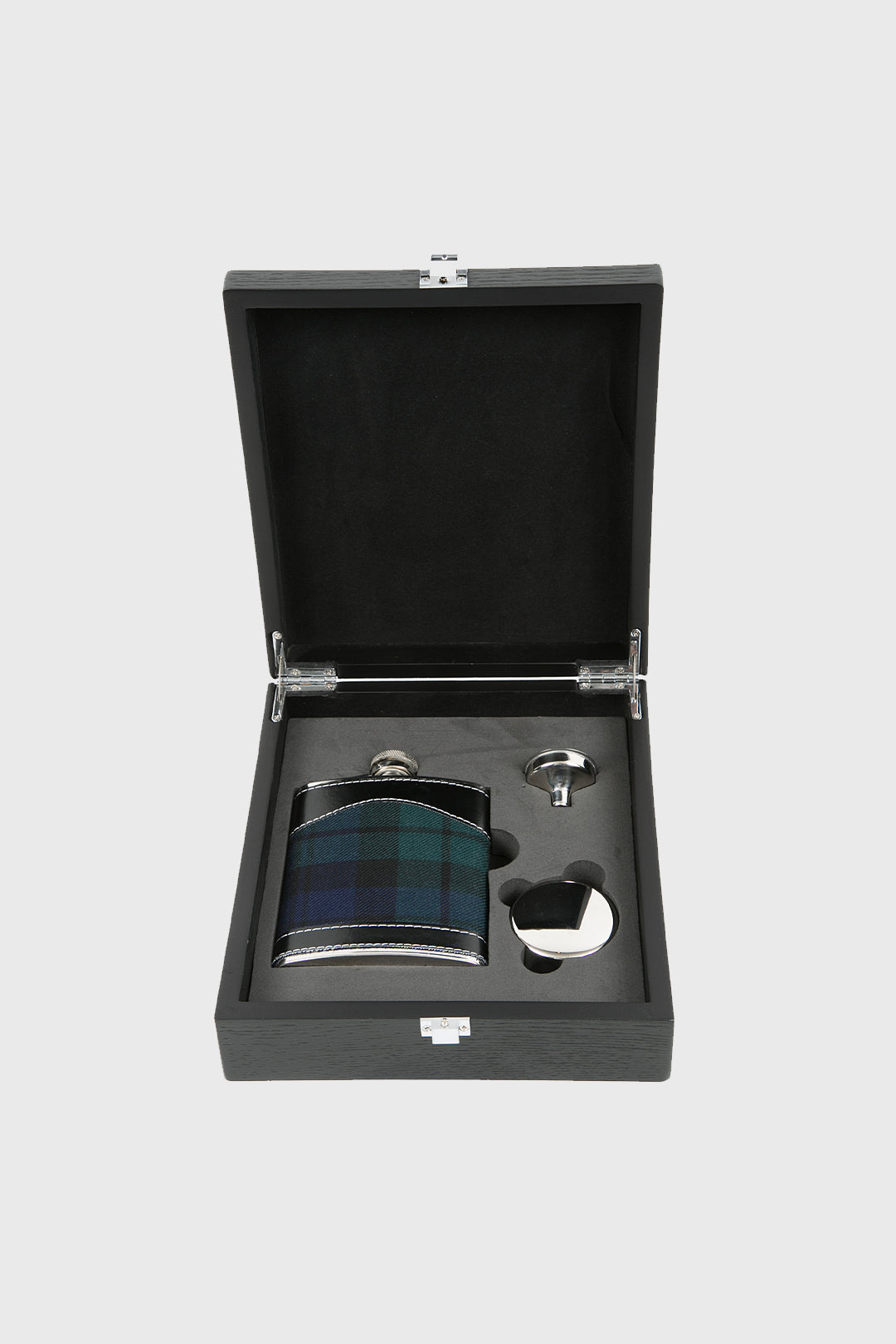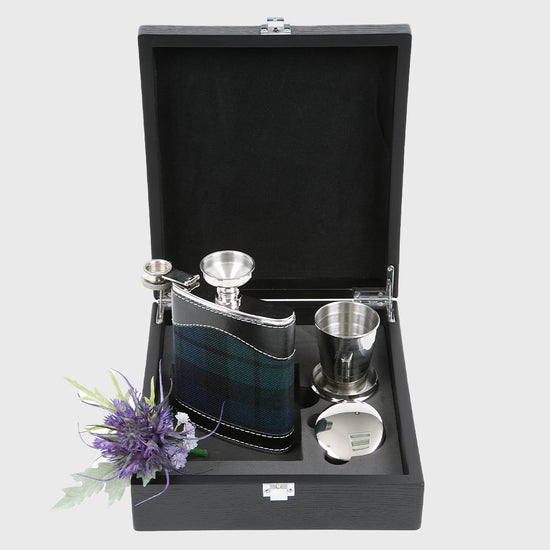 Timeless and distinguished, this gift set includes a stainless steel hip flask clad in the iconic Black Watch tartan, paired with a funnel and collapsible cup. Elegantly presented in a black wood-effect box, it’s a classic nod to Scottish heritage.