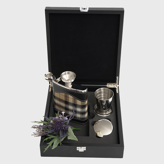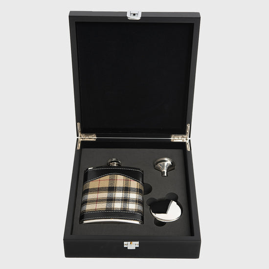 A stylish blend of tradition and luxury, this gift set features a stainless steel hip flask in Gold Pride tartan. Supplied with a funnel and collapsible cup in a black wood-effect box, it’s a refined piece that makes an impression.