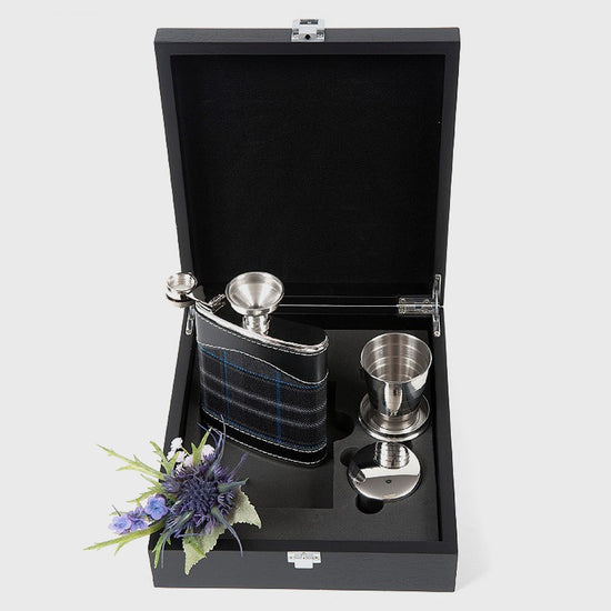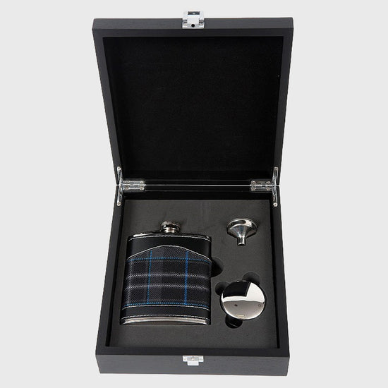 Distinguished and bold, the Royal Pride hip flask set features a stainless steel flask clad in regal tartan tones. With a funnel and collapsible cup included, it comes beautifully presented in a black wood-effect box.